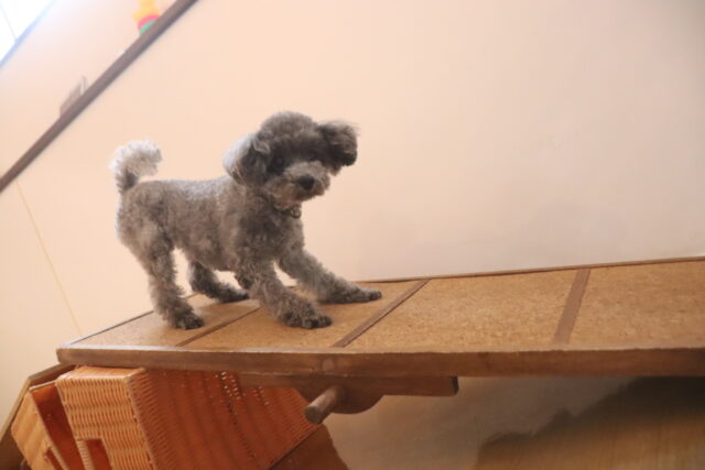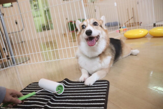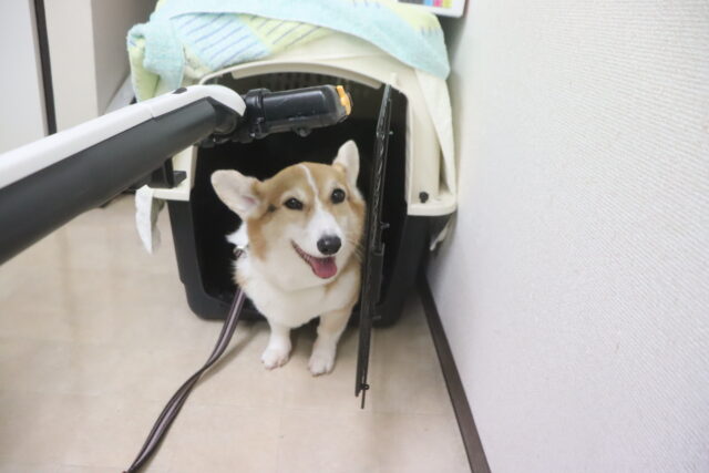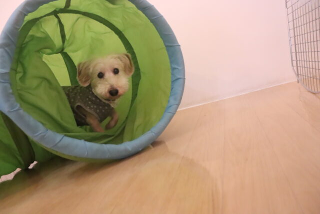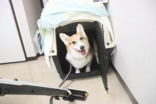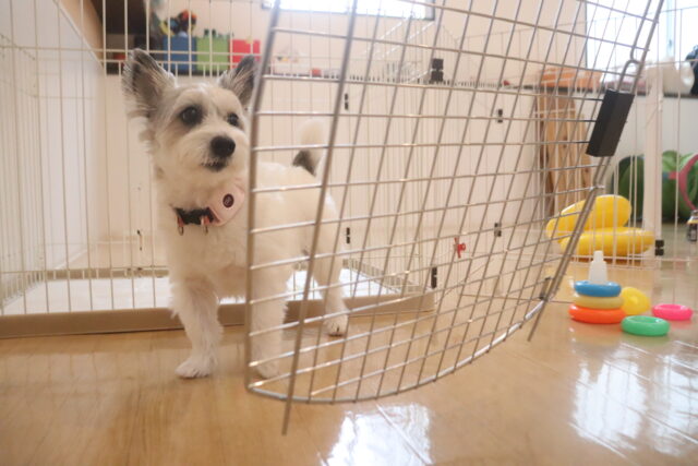ソフィちゃんはクレートの扉を使って物・音慣れをしています!