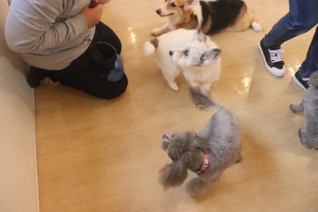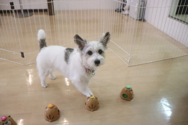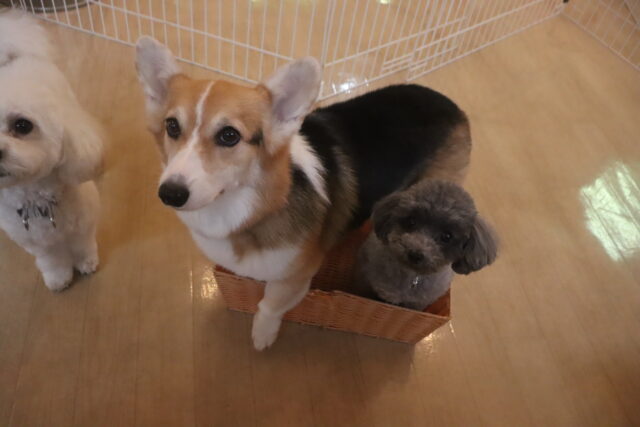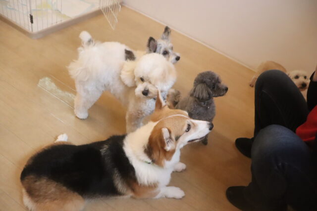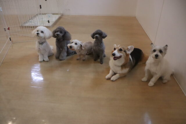 今日の保育園生は、ワイヤーヘアードミニチュアダックスフンドの小梅ちゃん、ジャックラッセルテリアのソフィちゃん、ウェルシュコーギーペンブロークのサクラちゃん、トイプードルのモモちゃん、マルチーズ×トイプードルの陽向くんです!