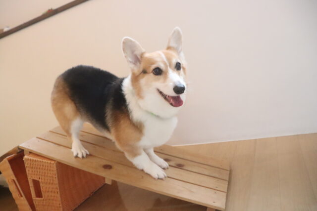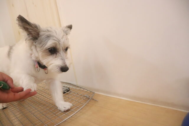 何とかクレートの扉の上に乗ってお手が出来ましたが、表情は不安そう(´・ω・`)💧