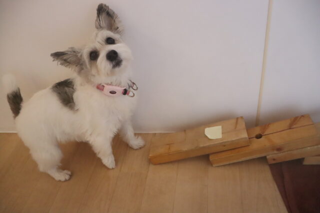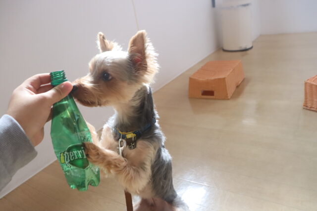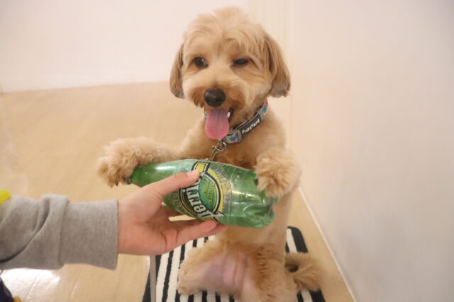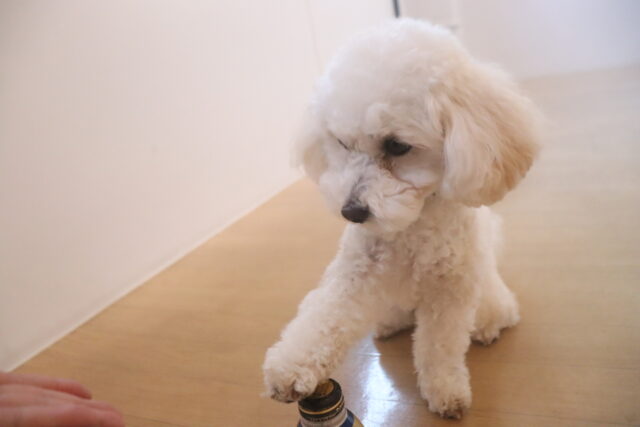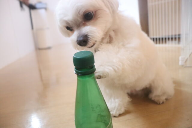 ペットボトルが倒れたときの音が苦手なので、スムーズに倒すことはまだ出来ませんでしたが前足で触ることは出来ました👏