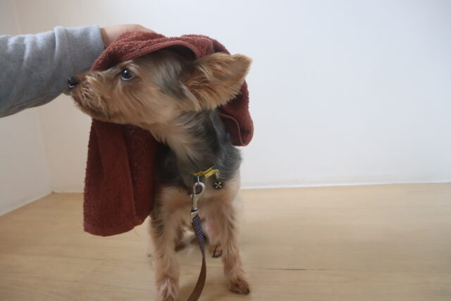 ルイくんはタオルで顔周りや体を拭く練習をしています!