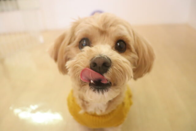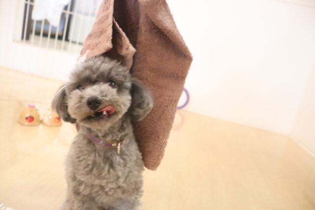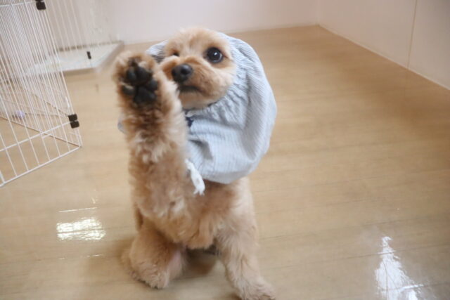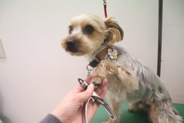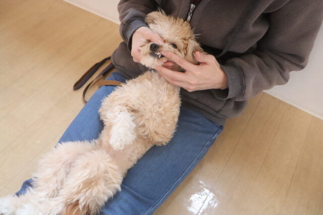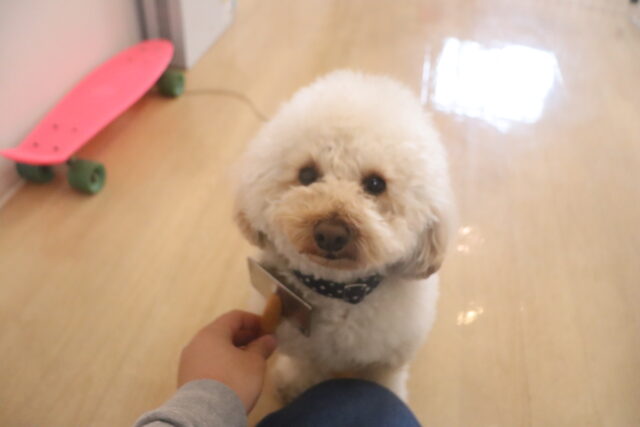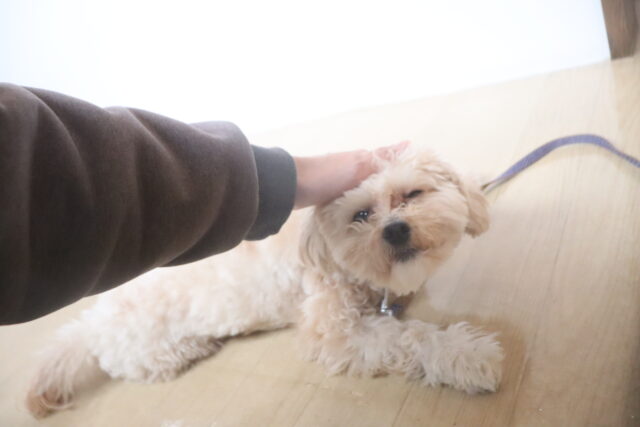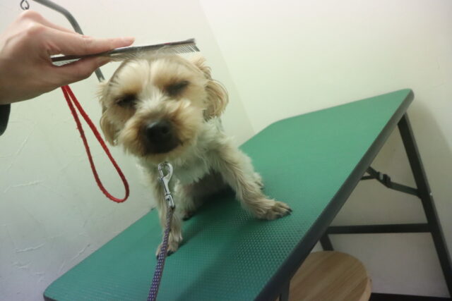 ノアくんはトリミング台でケア練習を頑張りました!苦手な事に薄目になってしまうノアくん😑
