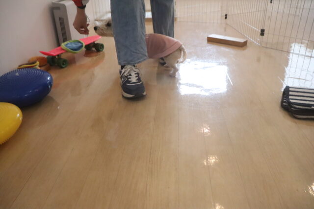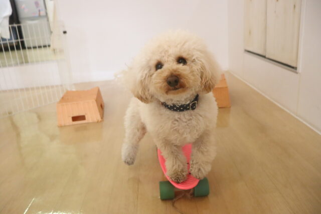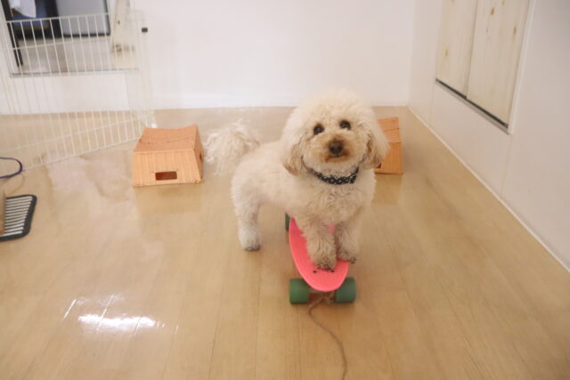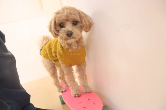 晴くんはスケボーの練習をしました!後ろ足を器用に使い地面をキック!