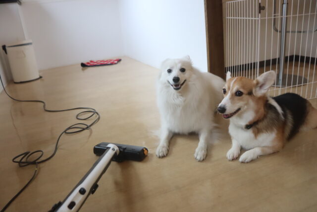 掃除機のスイッチを入れると音に驚き、耳が後ろに引いてしまう二頭💦それでも最後まで取り組んでくれましたよ👏