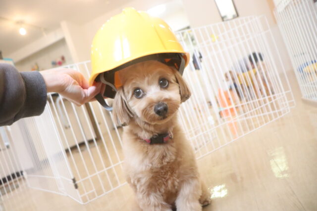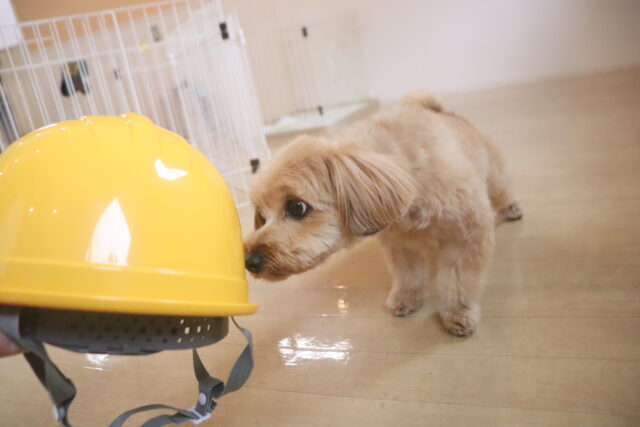 エマちゃんはヘルメットで物慣れを行いました♪見慣れないものにそーっと近づくエマちゃん😖