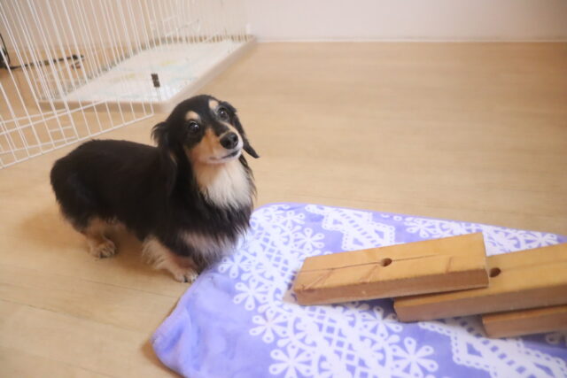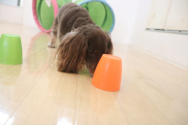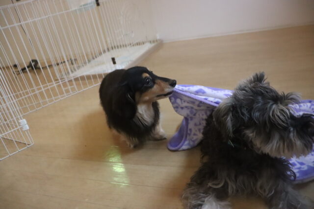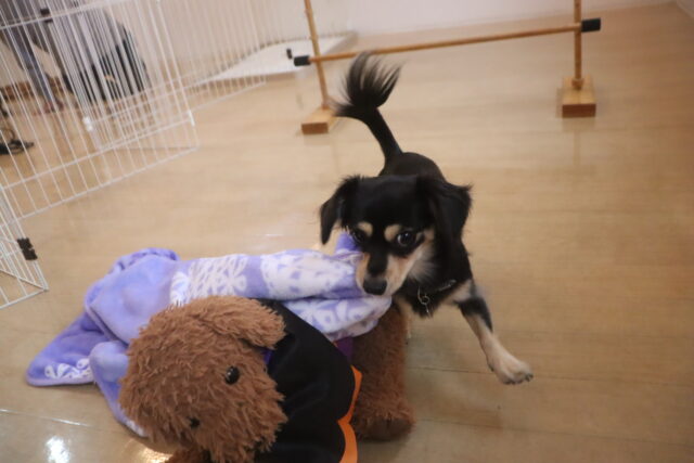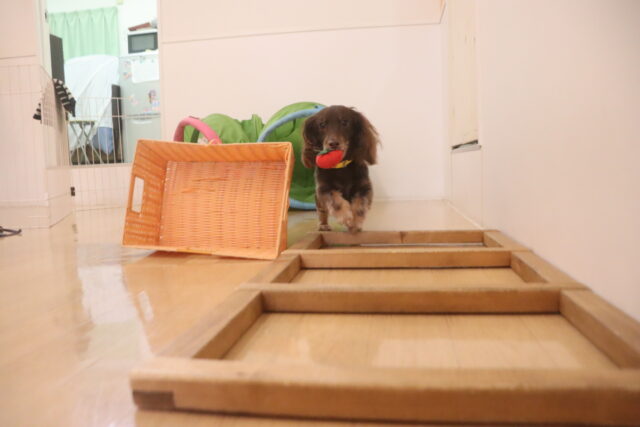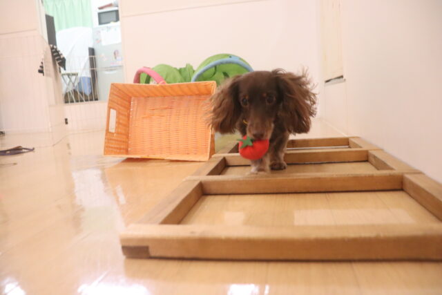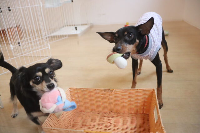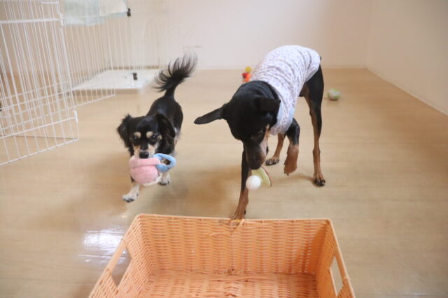 こころちゃんとルアくんはスタッフが散らかしたオモチャを2頭で協力して片付けてくれました!