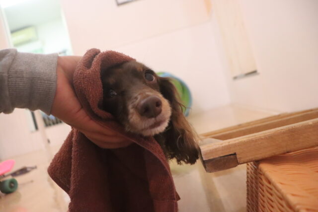 ミーシャちゃんはタオルで顔周りや体を拭く練習をしたね!