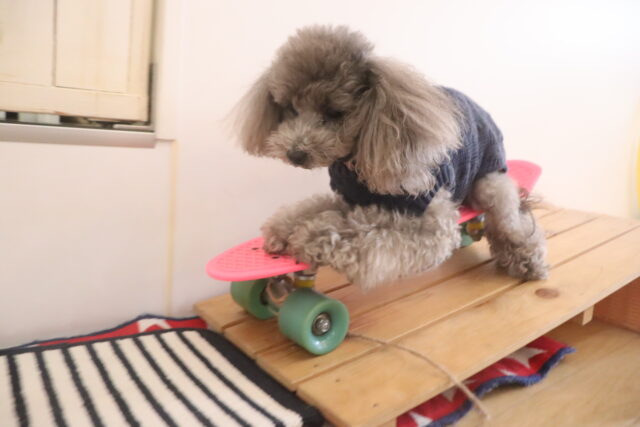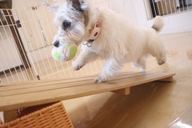 ここみちゃんはオモチャを咥えたままマットの練習!