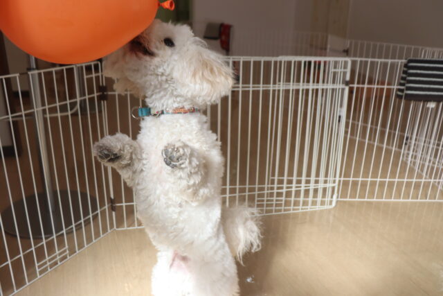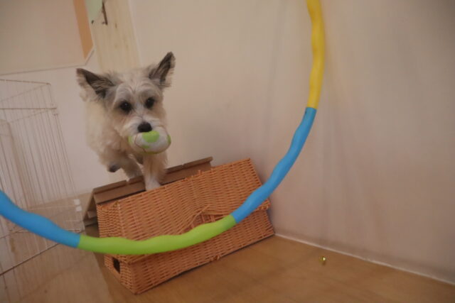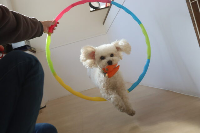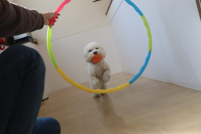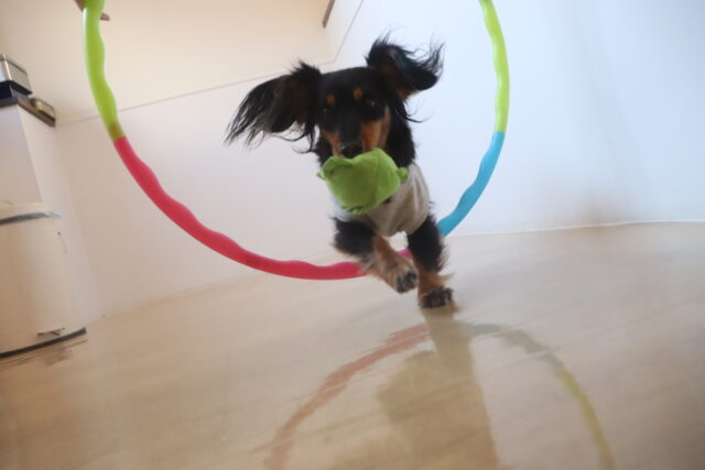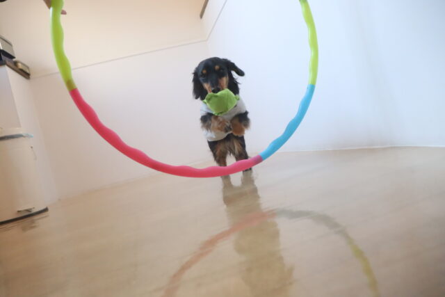 陽向くんはオモチャを咥えたままフラフープを飛ぶ練習!