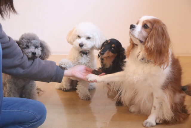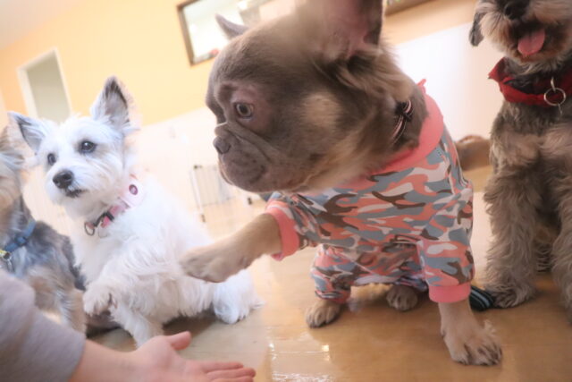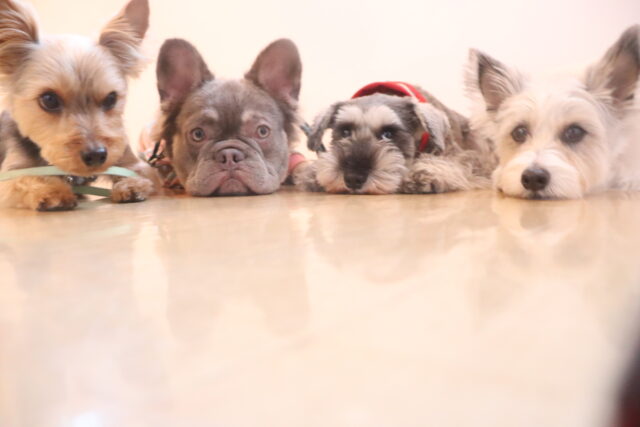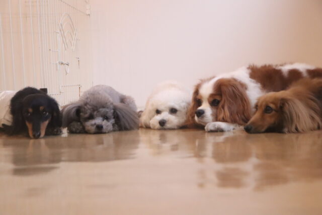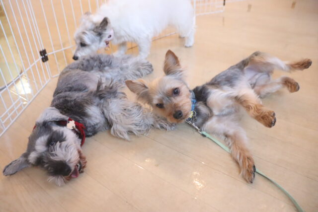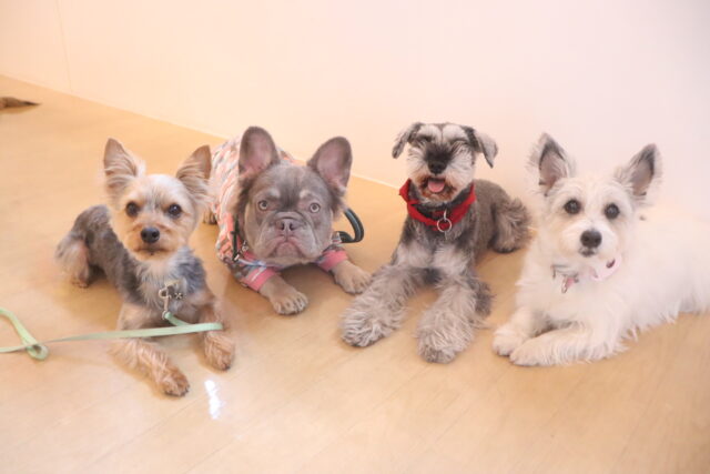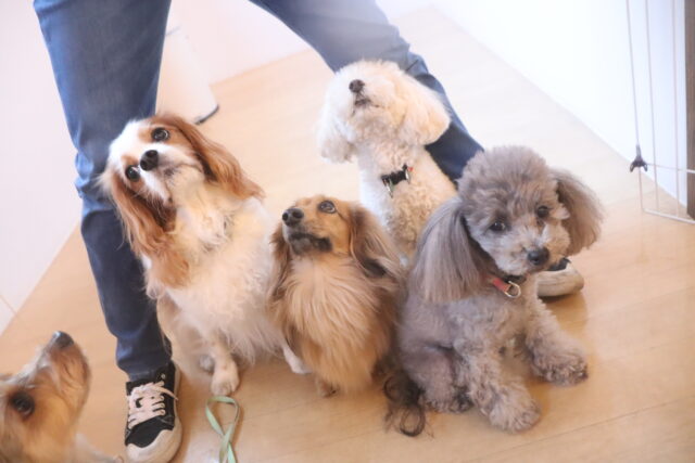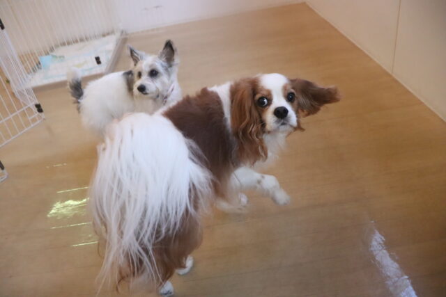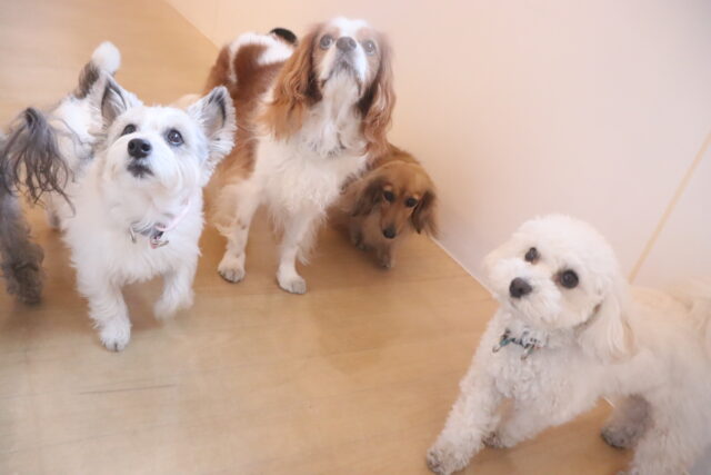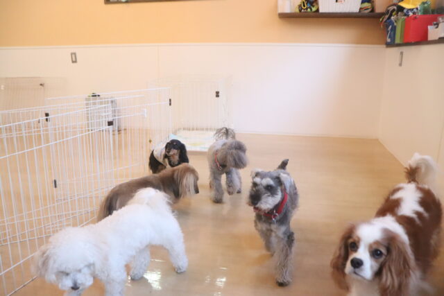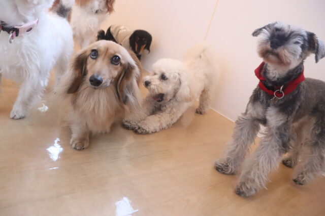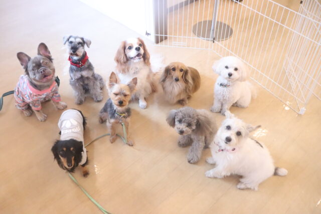 今日の保育園生は、ジャックラッセルテリアのソフィちゃん、キャバリアキングチャールズスパニエルの茶々丸くん、トイプードルのアンジュちゃん、カニンヘンダックスフンドのここみちゃん・ラテちゃん、ミニチュアシュナウザーのレイアちゃん、ヨークシャーテリアのルイくん、マルチーズ×トイプードルの陽向くん、フレンチブルドッグのハイちゃんです!