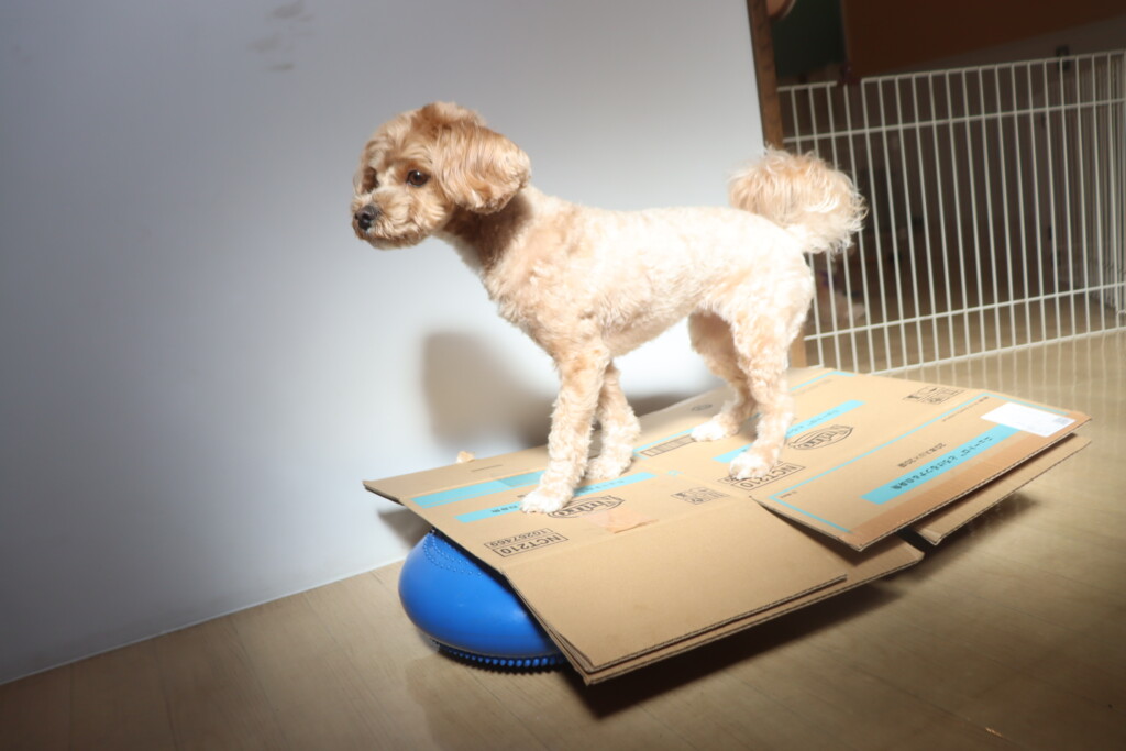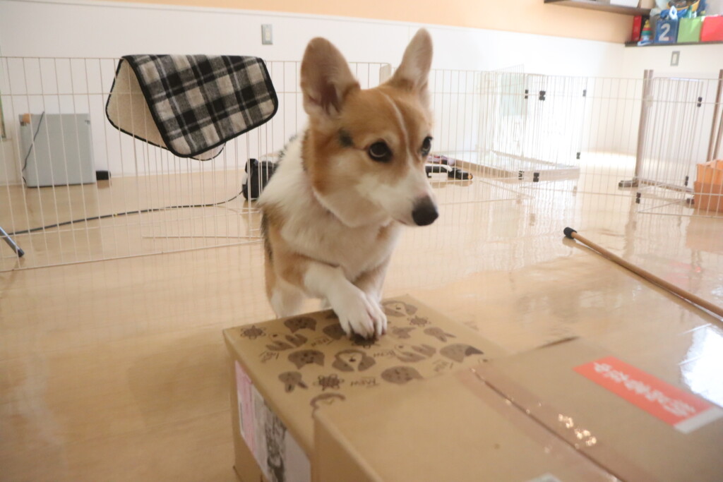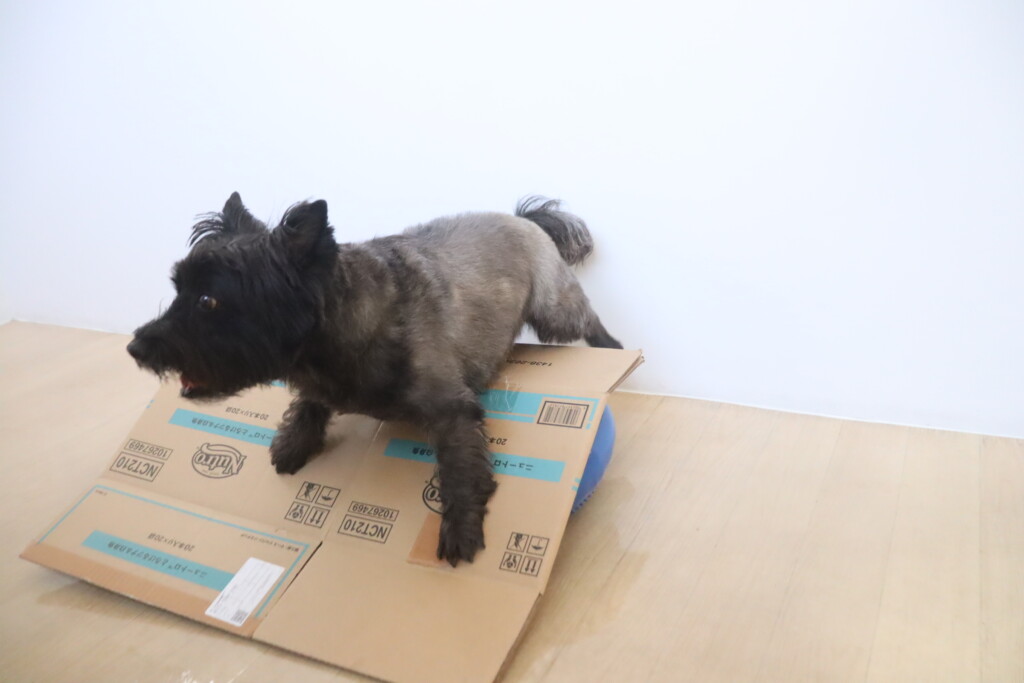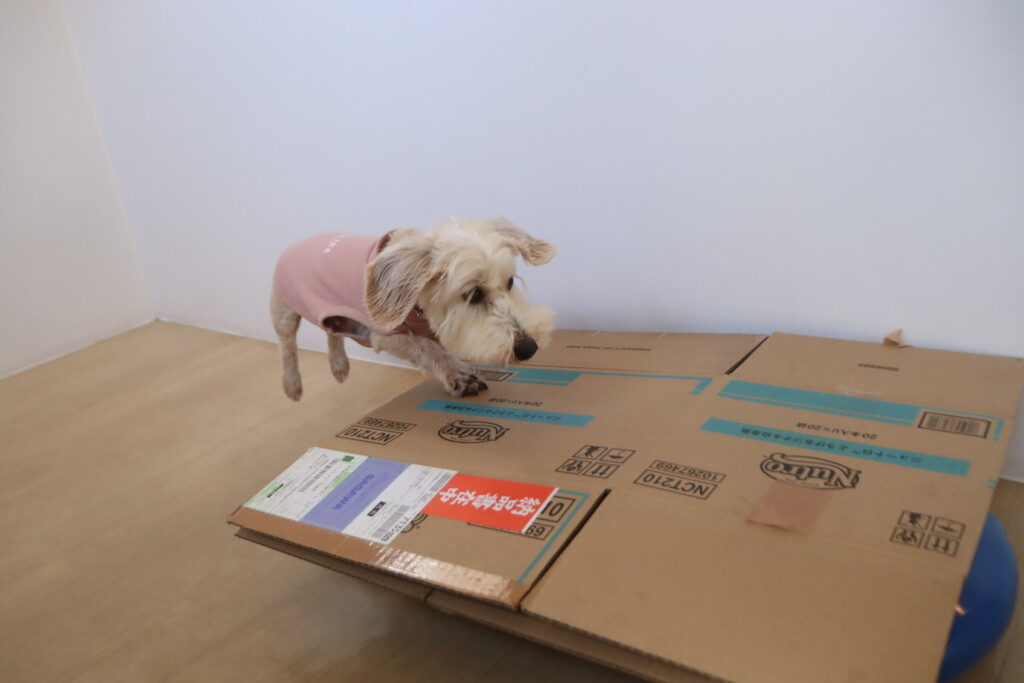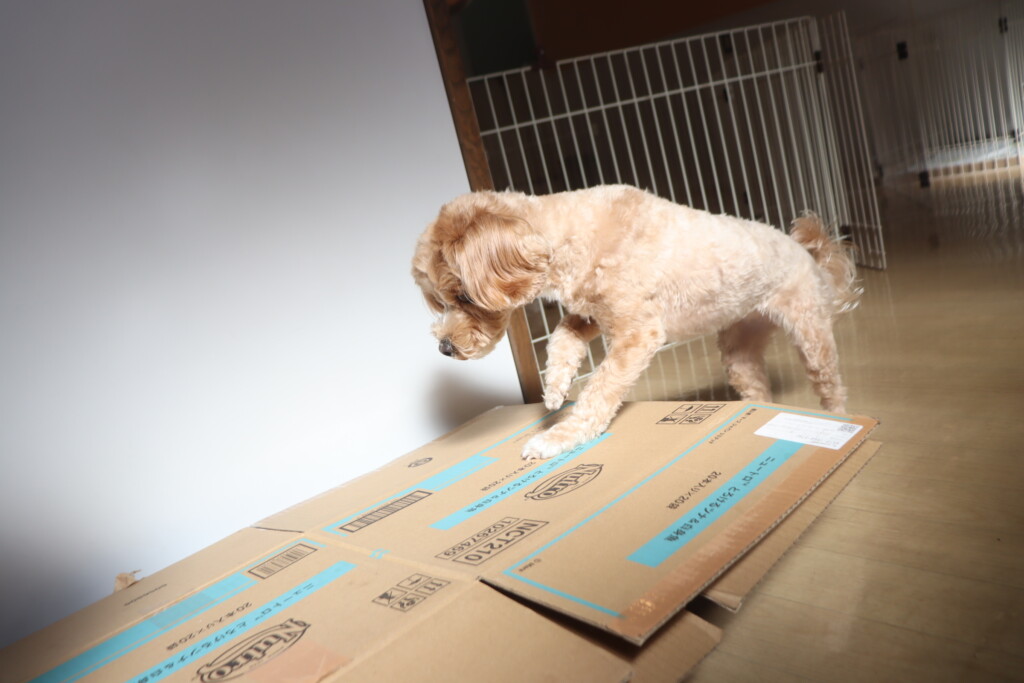 アンディくん、エマちゃん、サクラちゃん、レイアちゃんはダンボールに乗って足場慣れ!