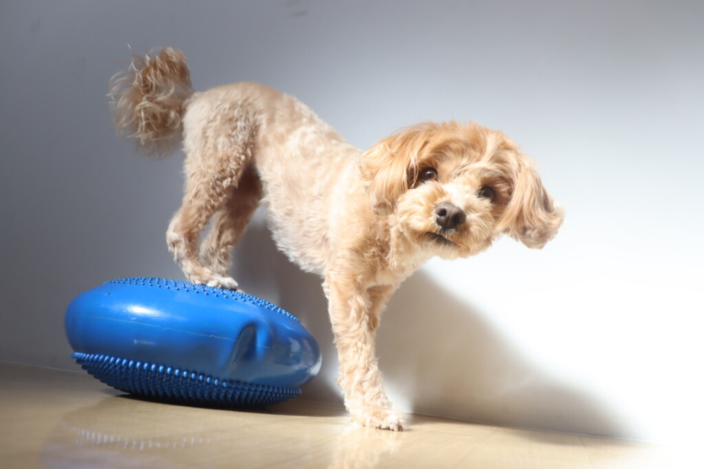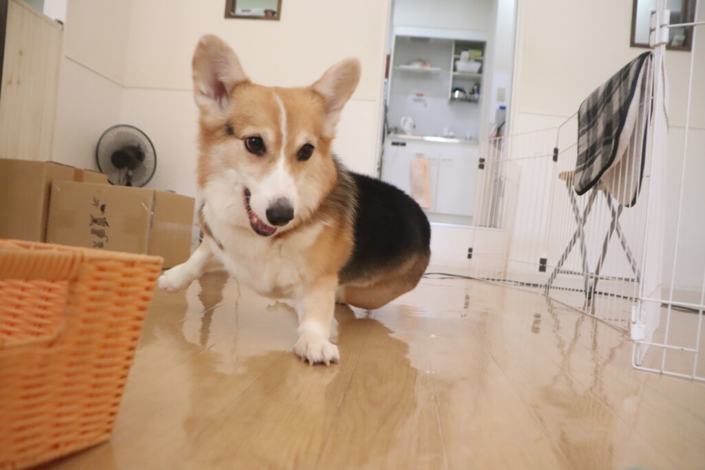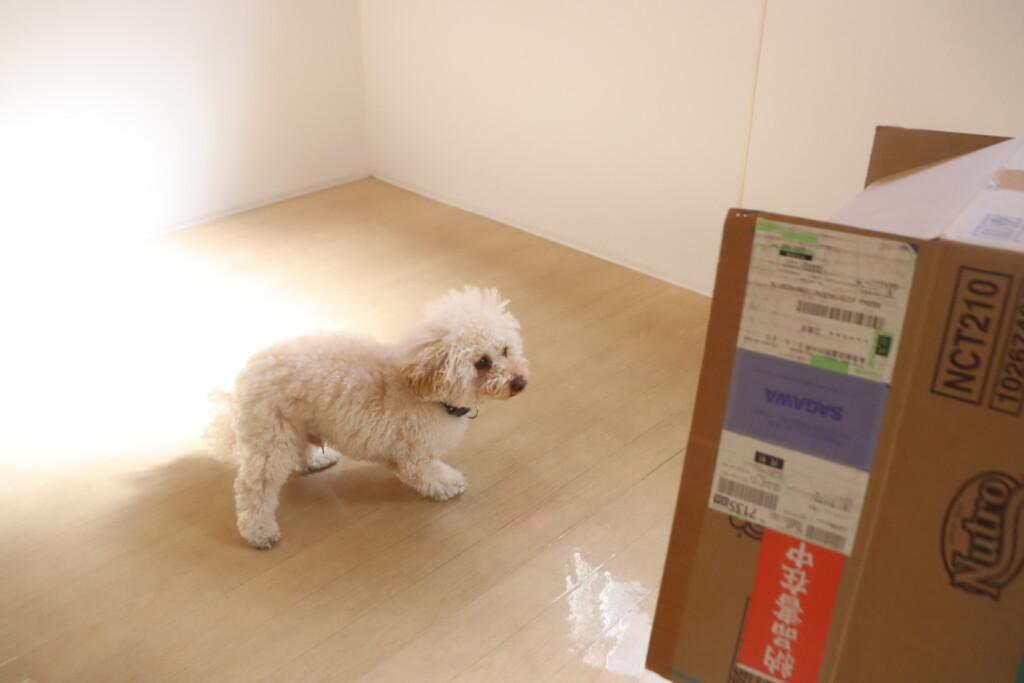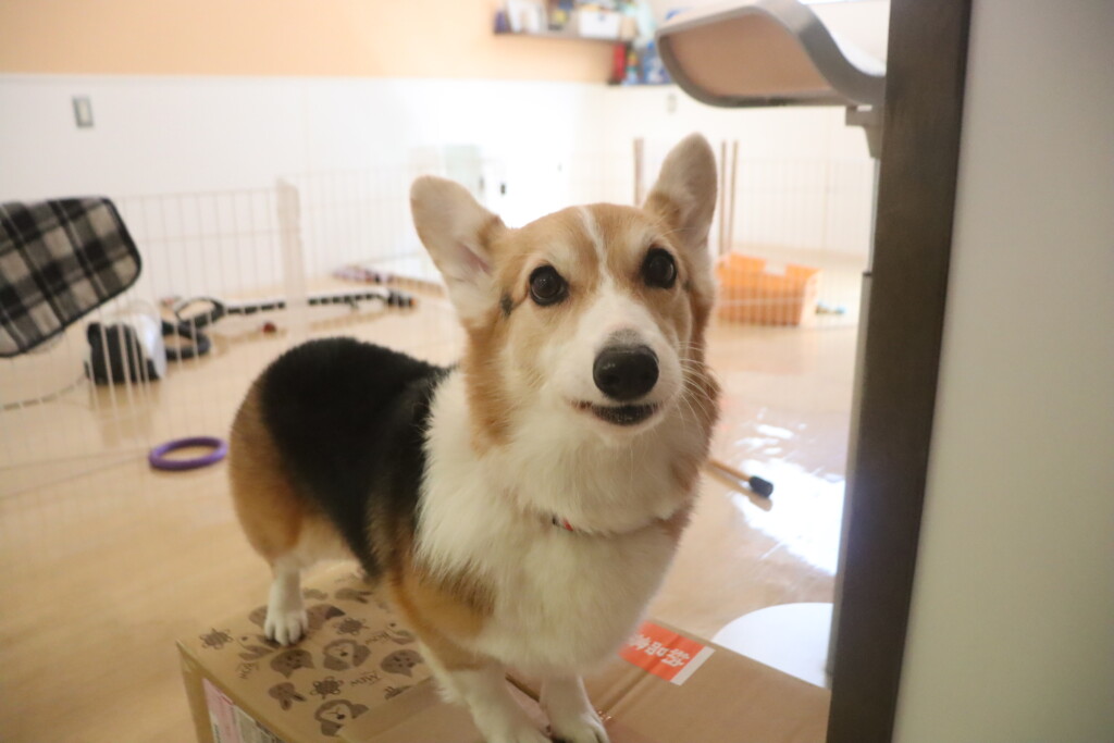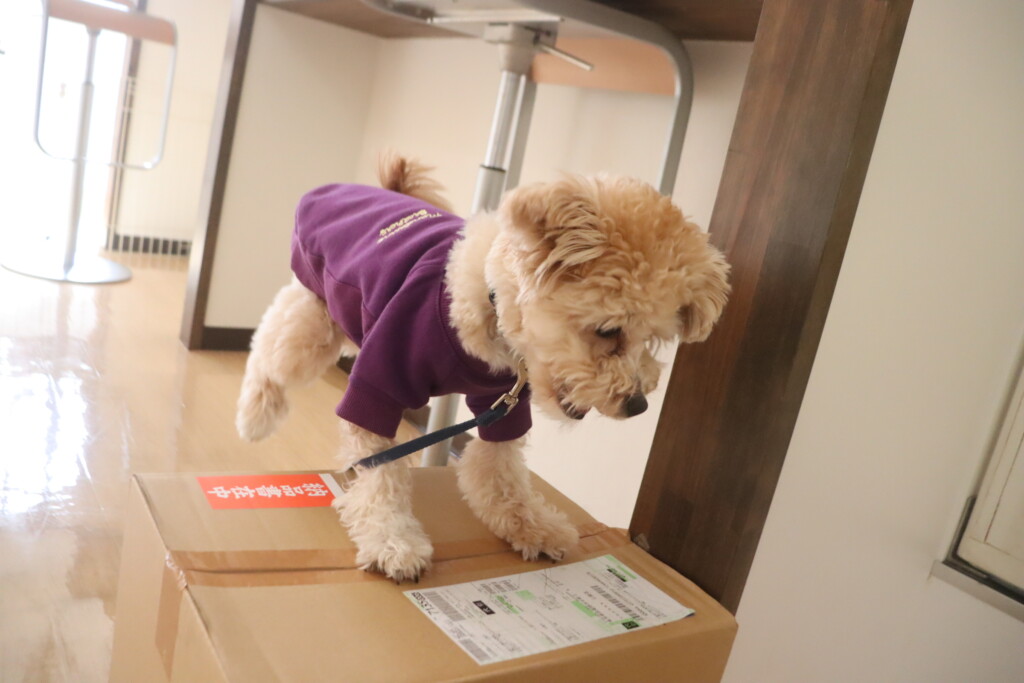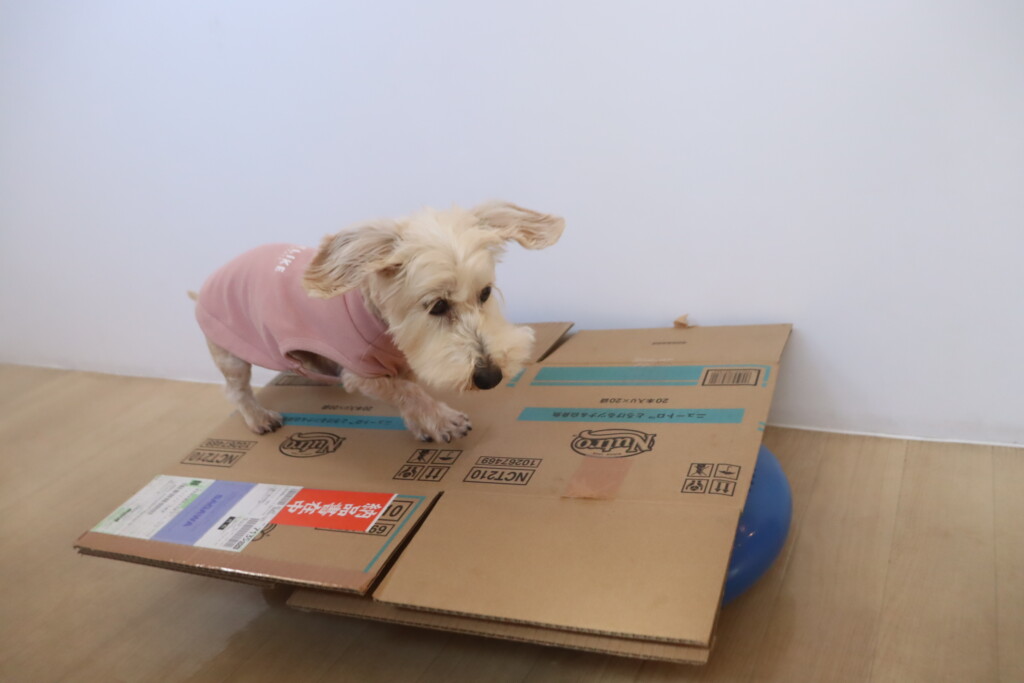アンディくん、エマちゃん、サクラちゃん、レイアちゃんはダンボールに乗って足場慣れ!