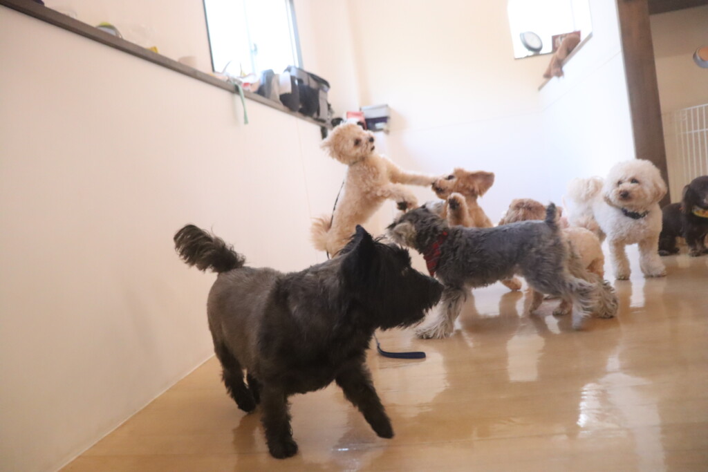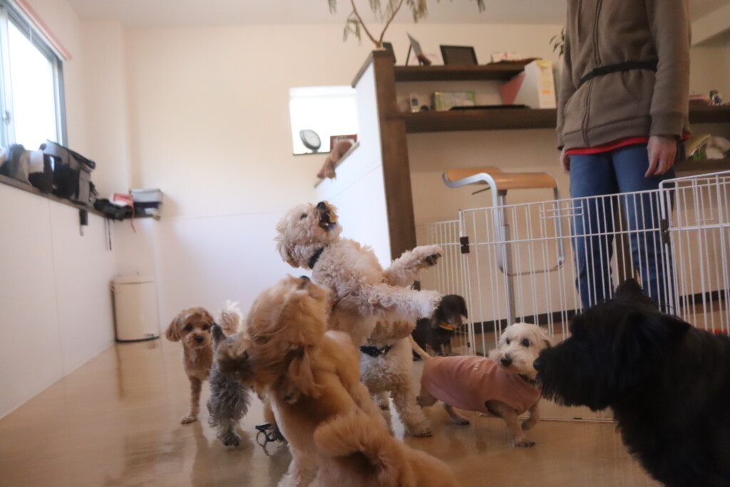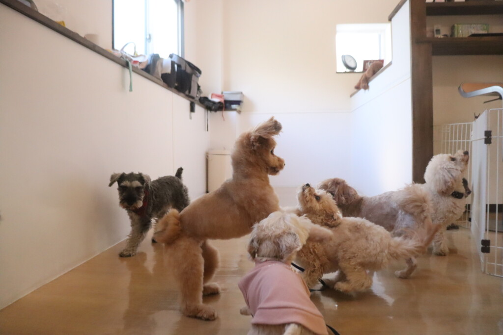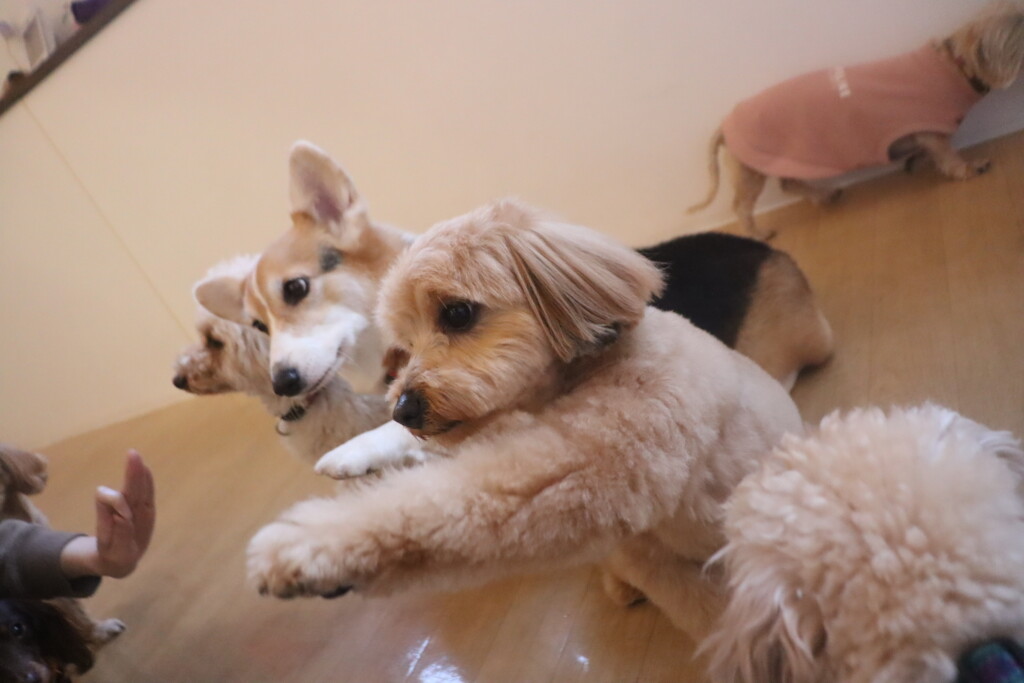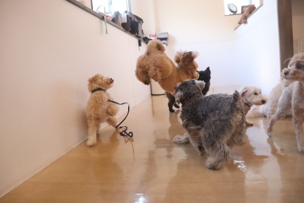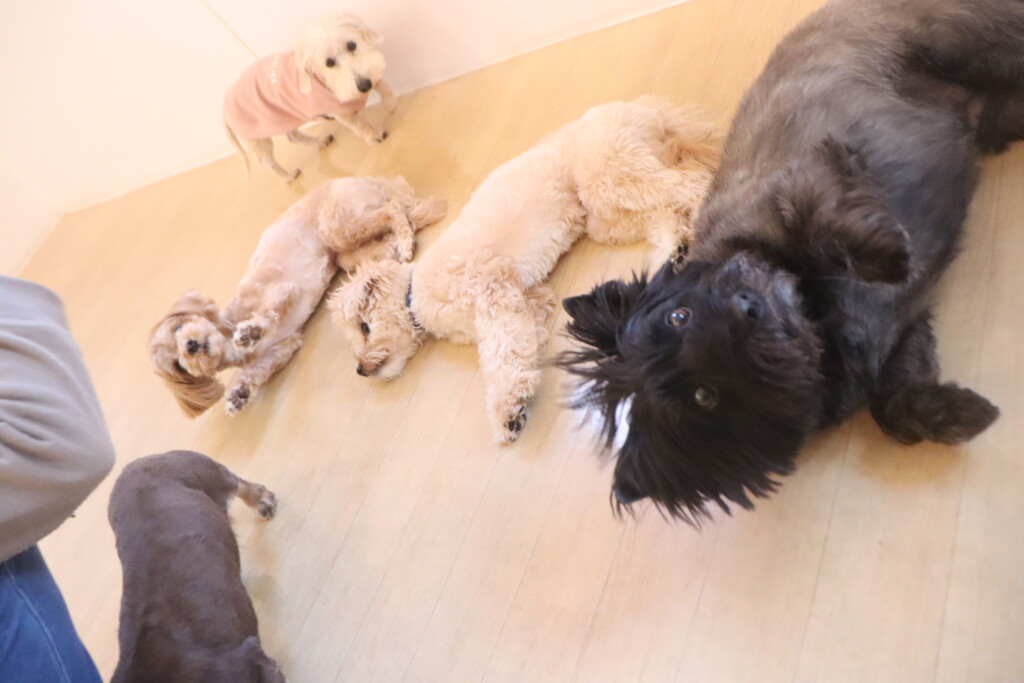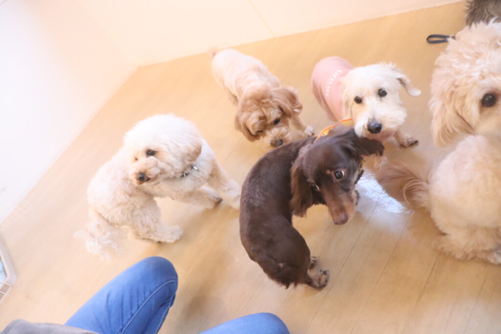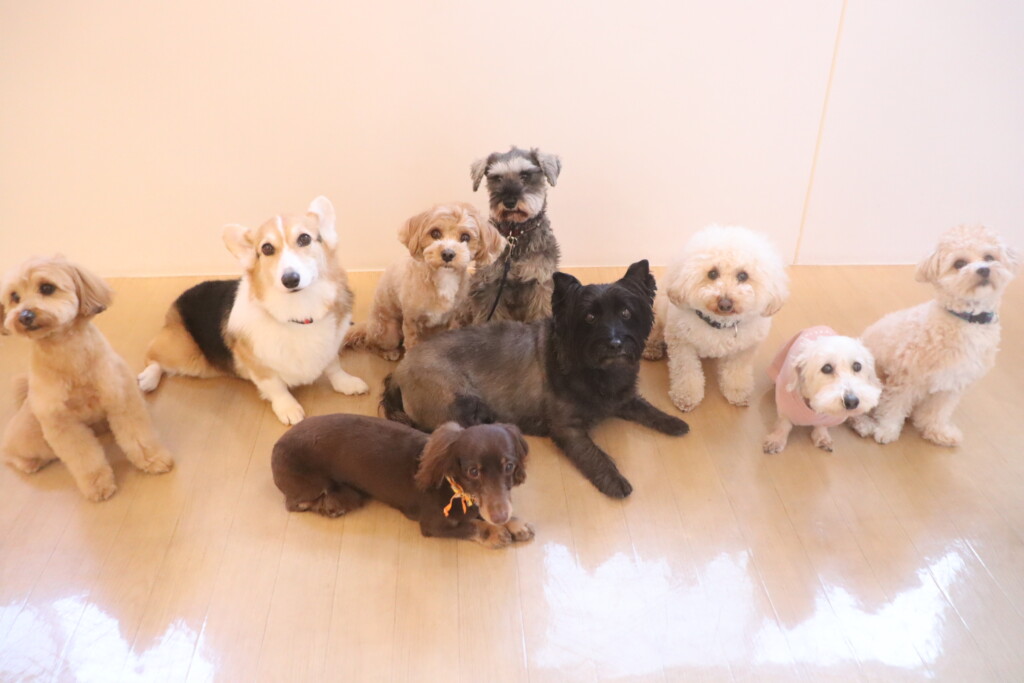 今日の保育園生は、マルチーズ×トイプードルのアンディくん・アリアちゃん・晴くん、ポメラニアン×トイプードルのエマちゃん、ミニチュアダックスフンドのミーシャちゃん、ウェルシュコーギーペンブロークのサクラちゃん、ワイヤーヘアードミニチュアダックスフンドの小梅ちゃん、ケアーンテリアのノンちゃん、ミニチュアシュナウザーのレイアちゃんです!