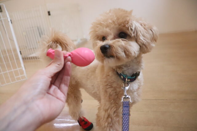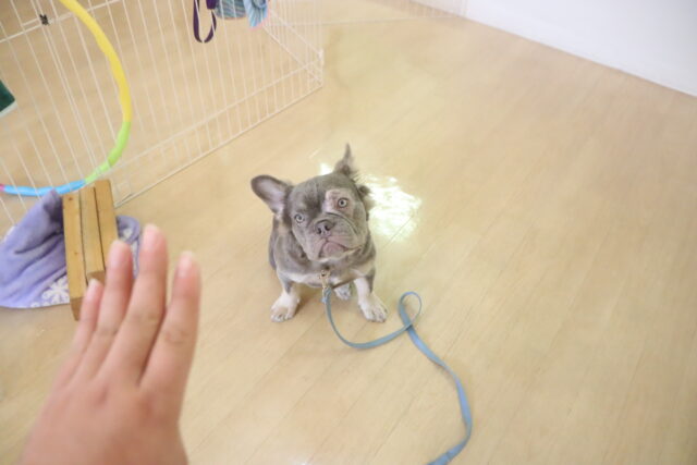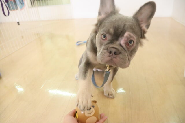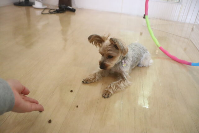 マテの指示をかけてから大好きなフードを目の前に転がすと、じーっと目は離せない様子でしたが食べようと動くことはなく頑張っていましたよ!!