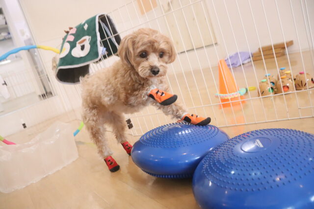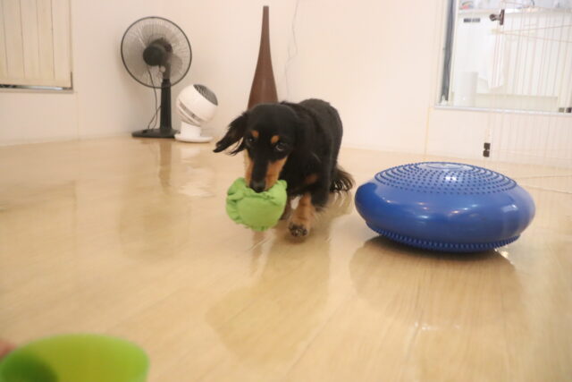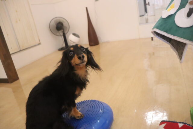 バランスディスクではいつもより厚みのある方を使うと、揺れの違いに驚いた様子のエマちゃんでした😂