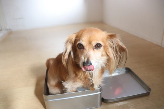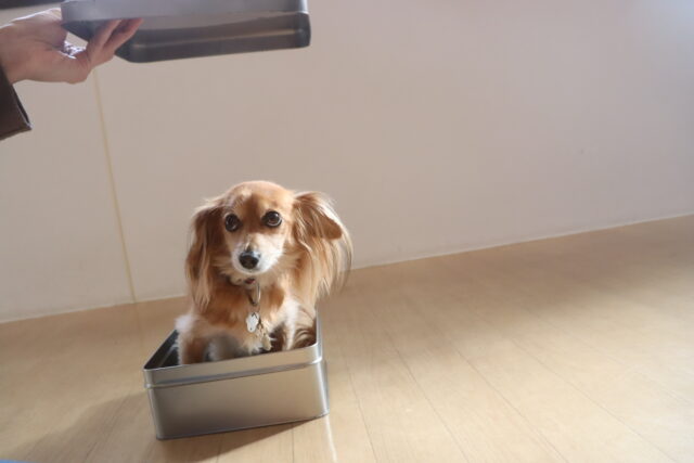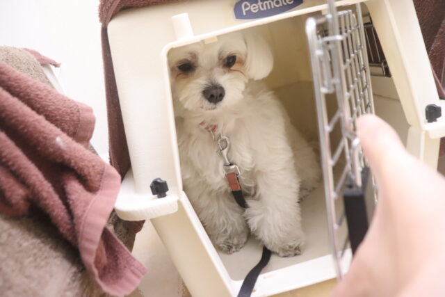 お家でも「ハウス」の指示一つでスムーズに入れるよう、クレート練習も定期的に行っています!