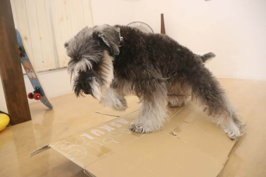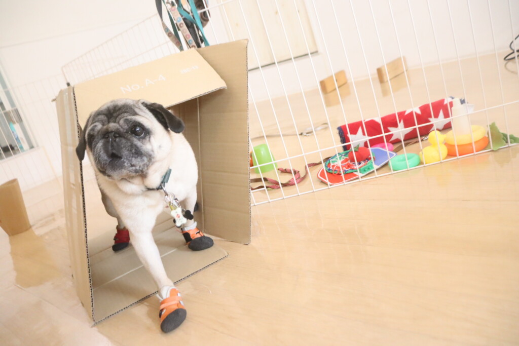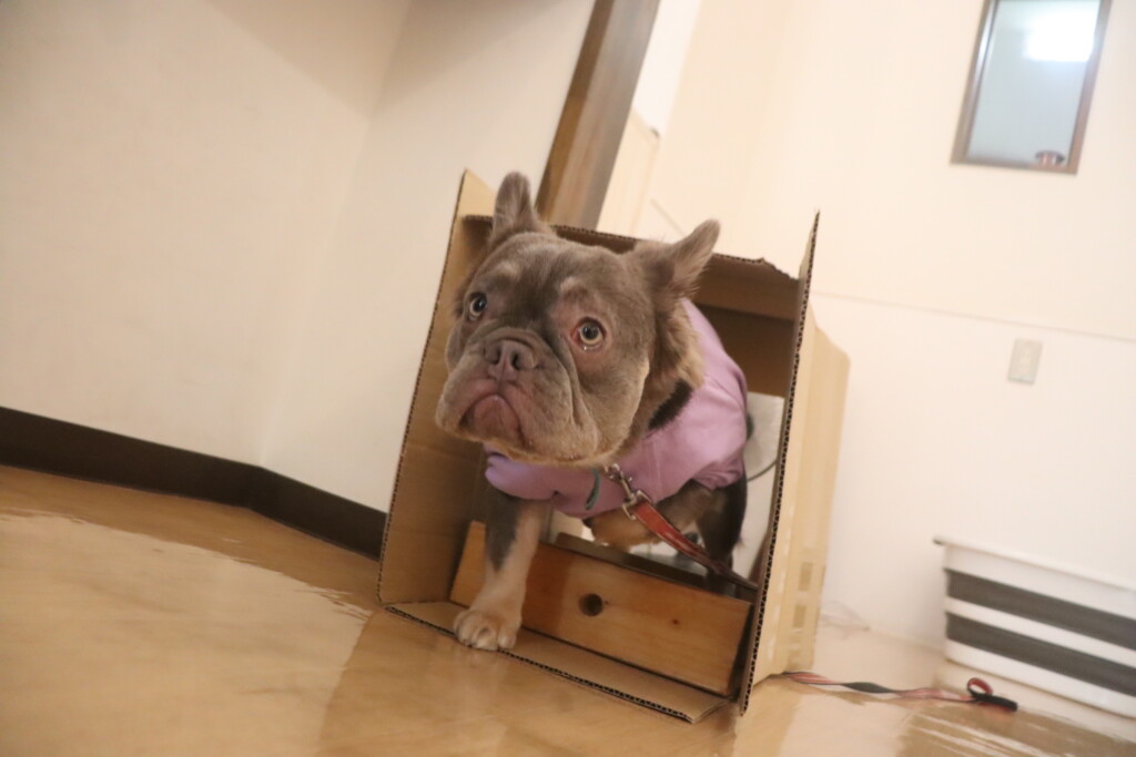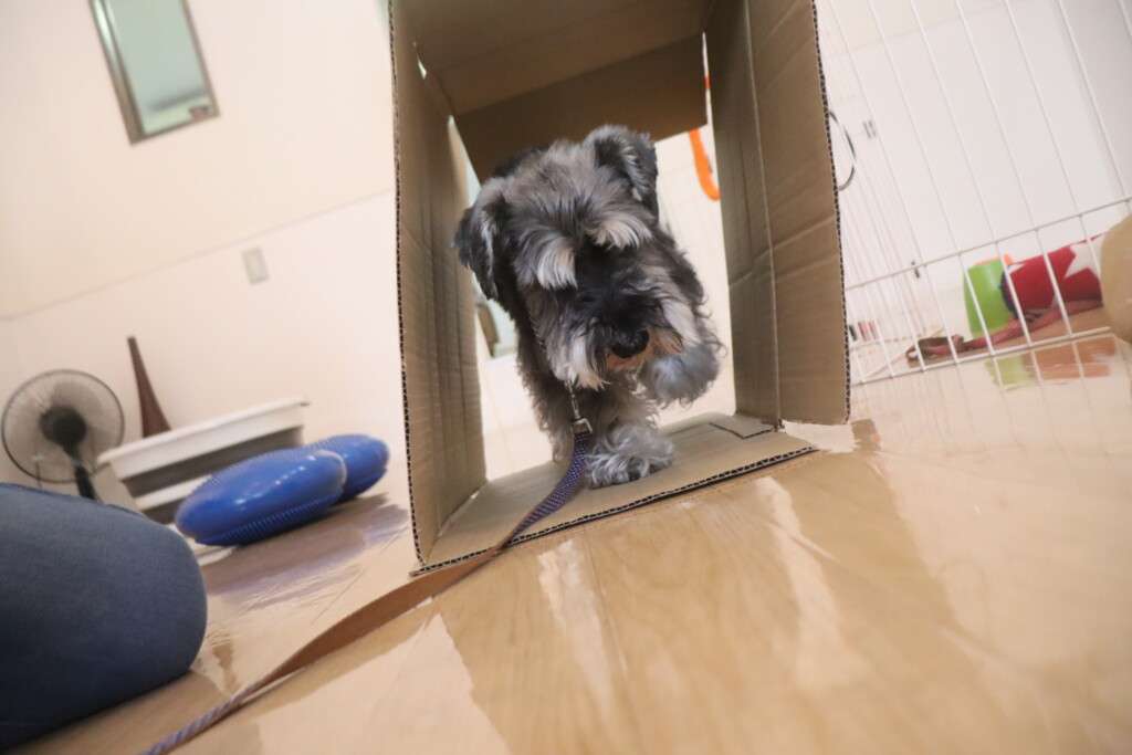 そのままダンボールくぐりに挑戦してもらうと、少し足元を気にしていましたが反対側までくぐり抜け成功です\(^o^)/