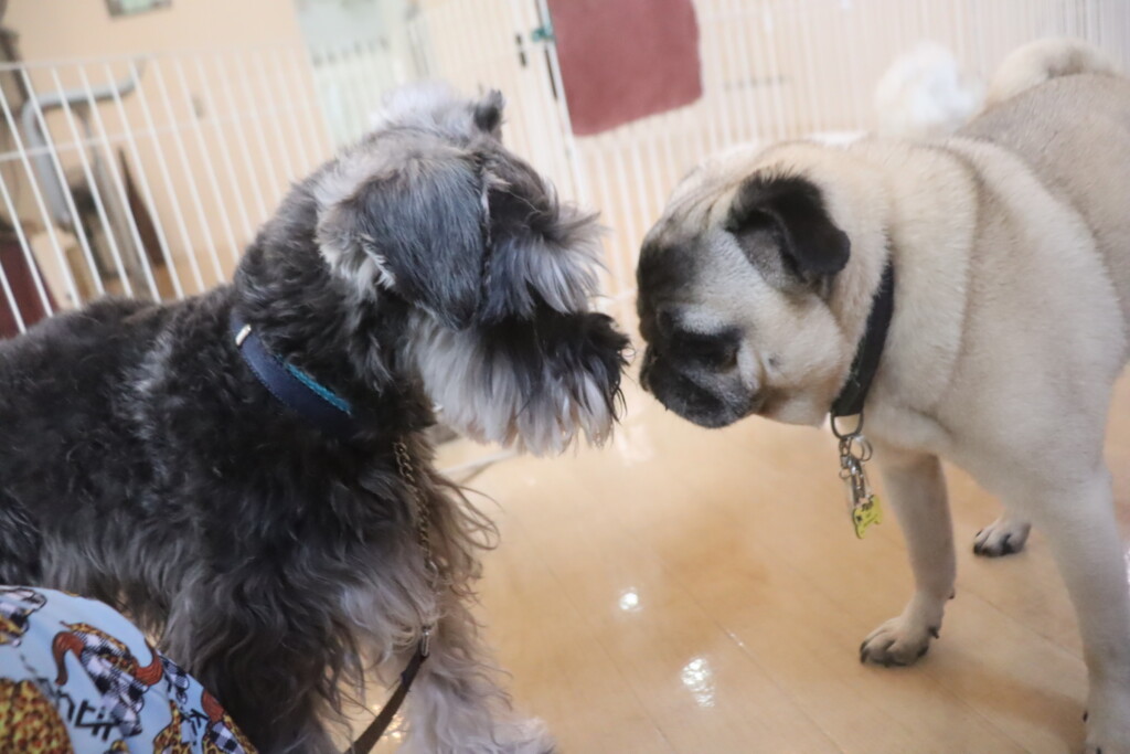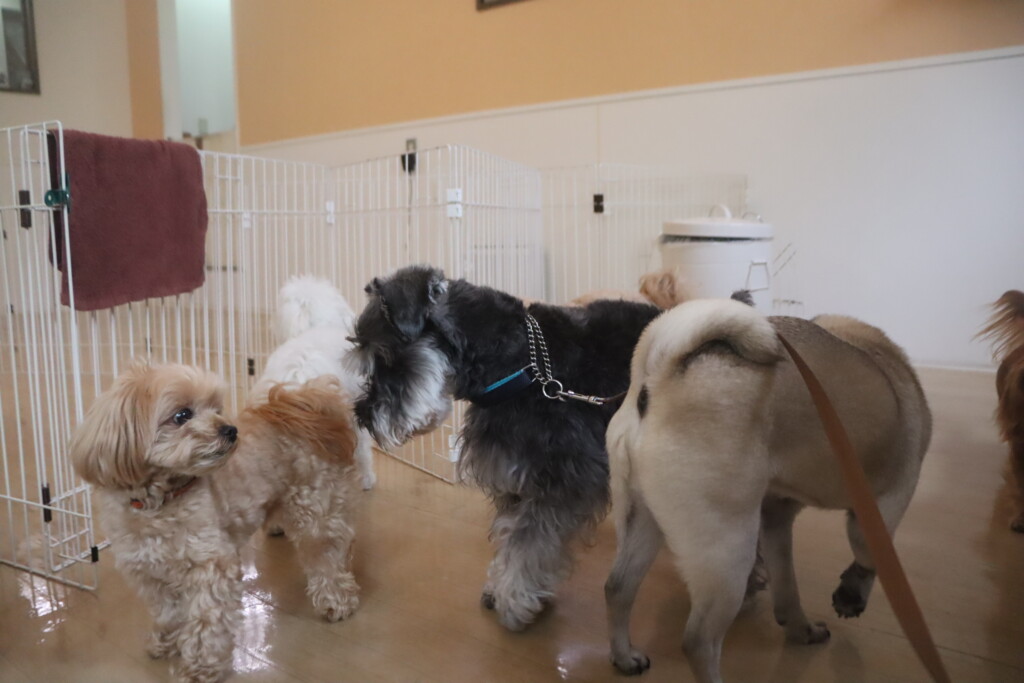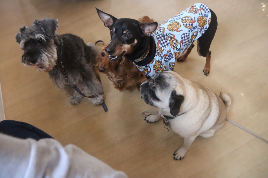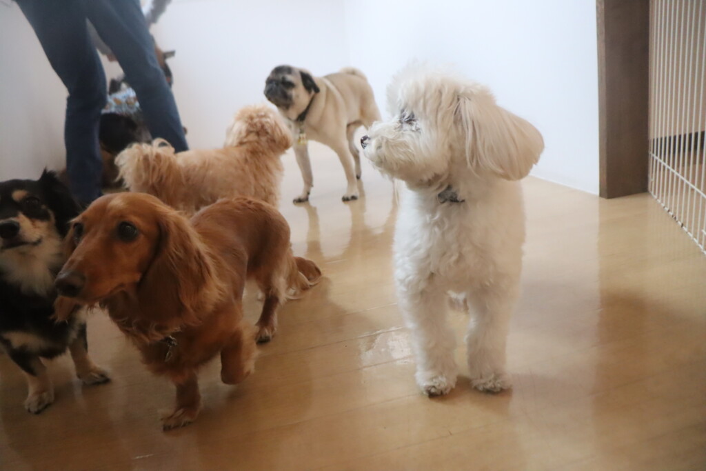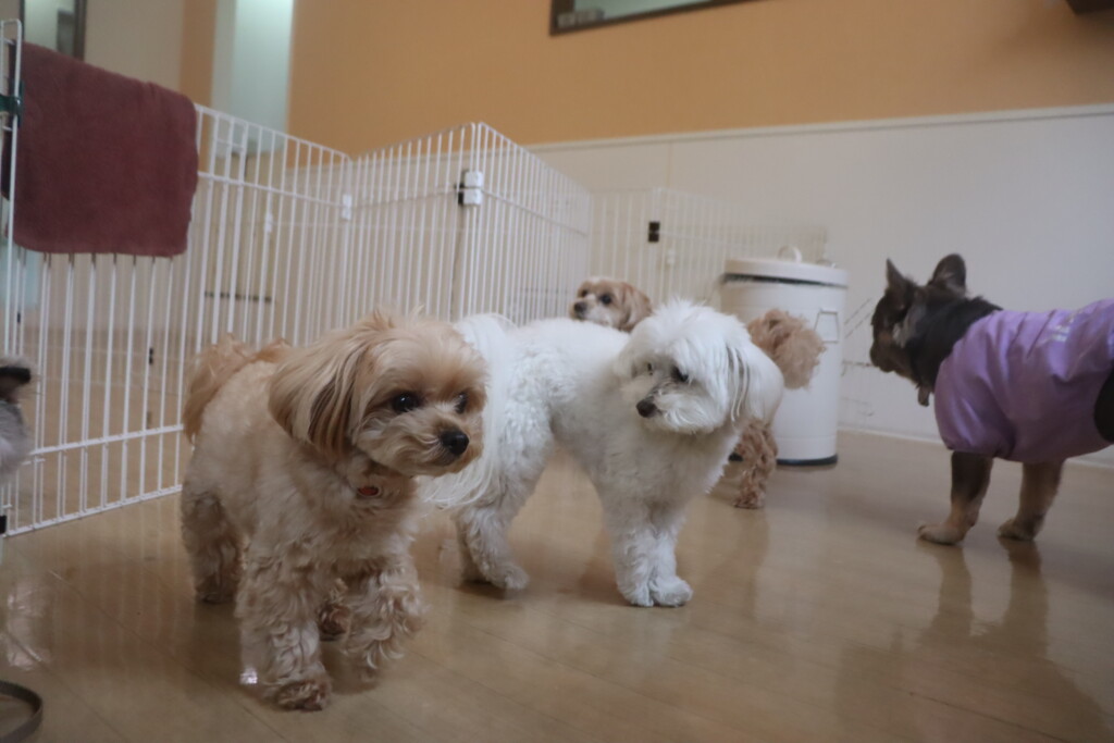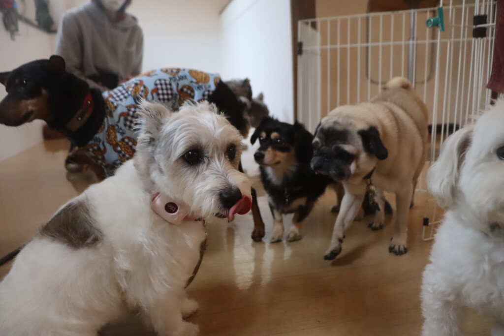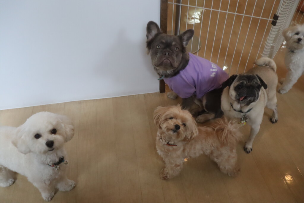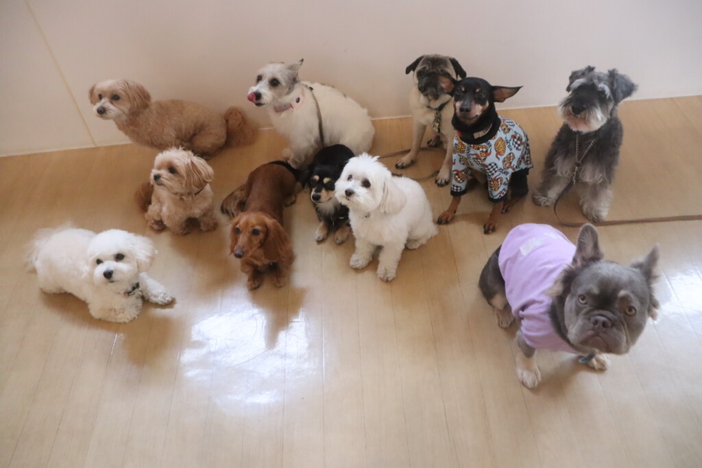 今日の保育園生は、パグのカールくん、ジャックラッセルテリアのソフィちゃん、ミニチュアシュナウザーのクオンくん、ミニチュアピンシャーのルアくん、マルチーズ×トイプードルのゆずちゃん・サンディちゃん・うるくん・陽向くん、チワワ×ミニチュアダックスフンドのこころちゃん、ミニチュアダックスフンドのみるもちゃん、フレンチブルドッグのハイちゃんです!