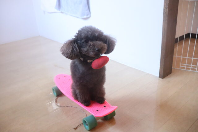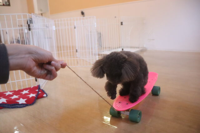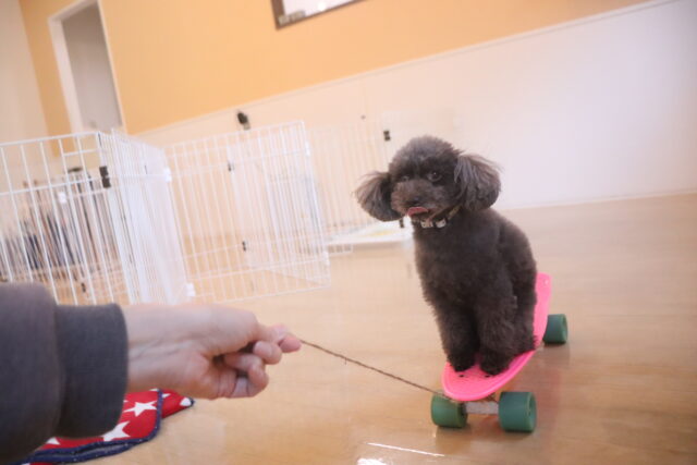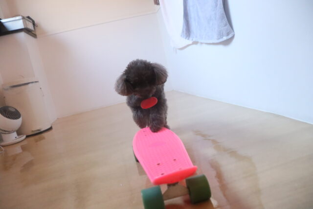 ココちゃんはスケボーに乗るのが上手なのでひもを引っ張ってみると「うわっ!」と焦った様子ではありましたが、