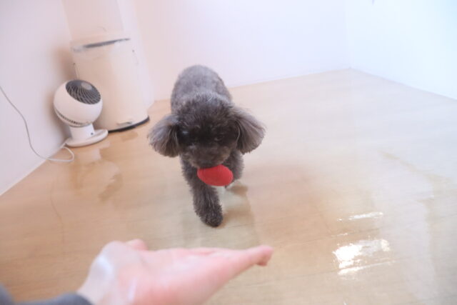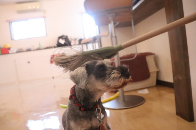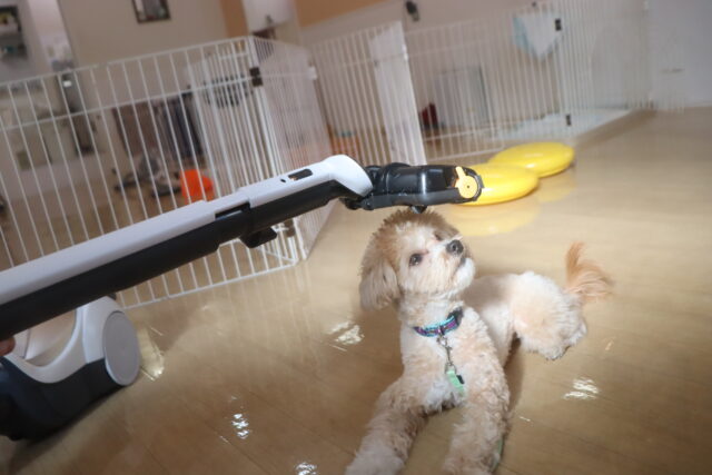 ハイちゃんは小型タイプの掃除機で練習!