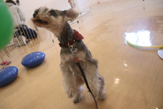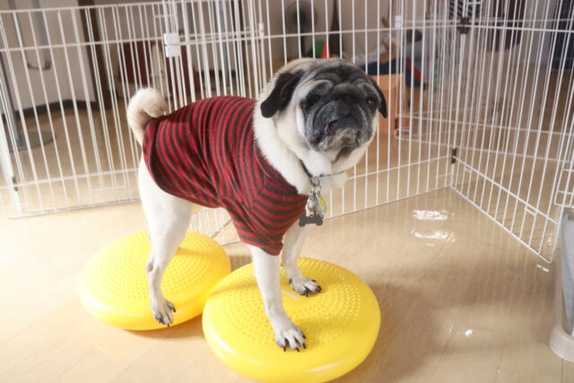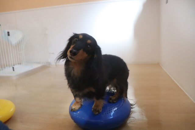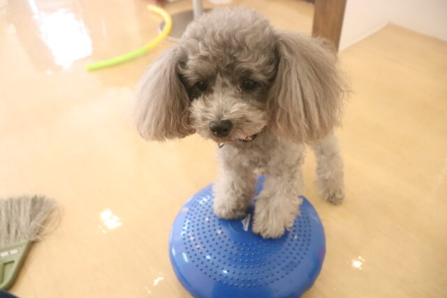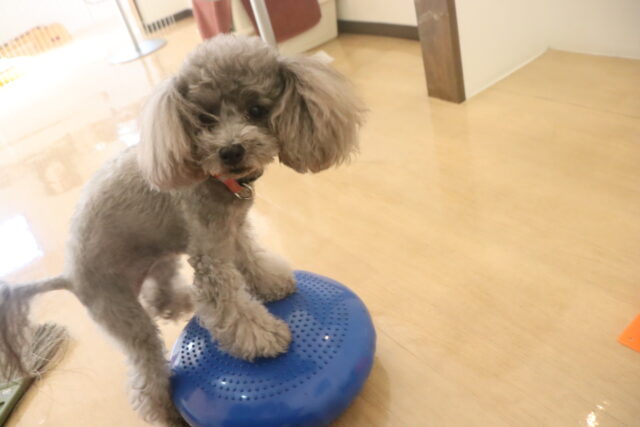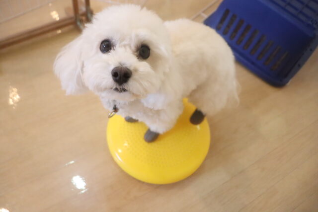 得意のバランスディスクは1つに4つ足を乗せて上手にバランスをとるここみちゃん!!