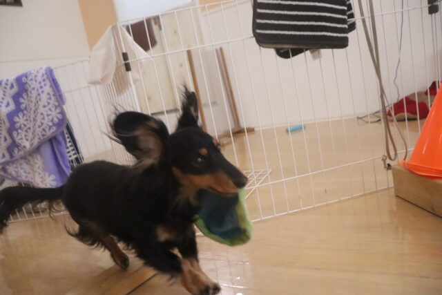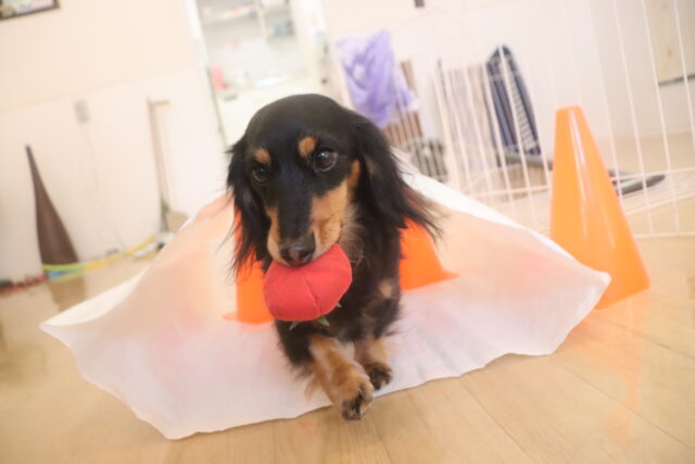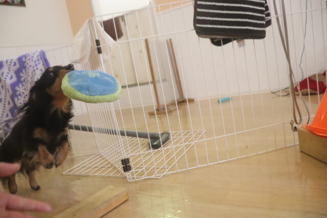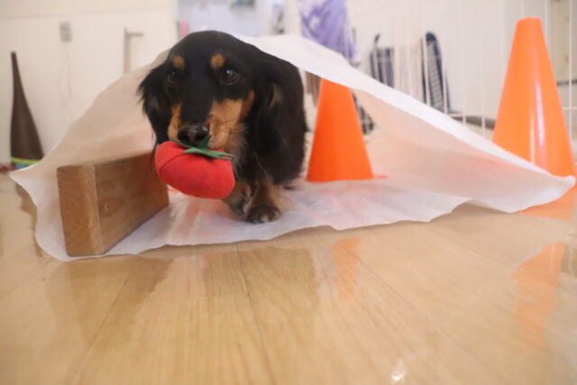 今日はオモチャを咥えてビニール袋を通過!!