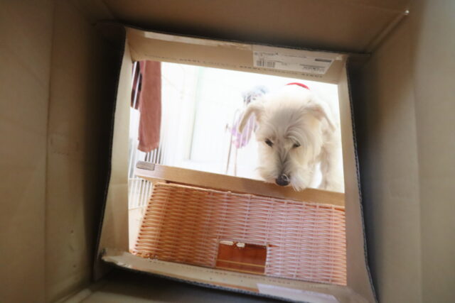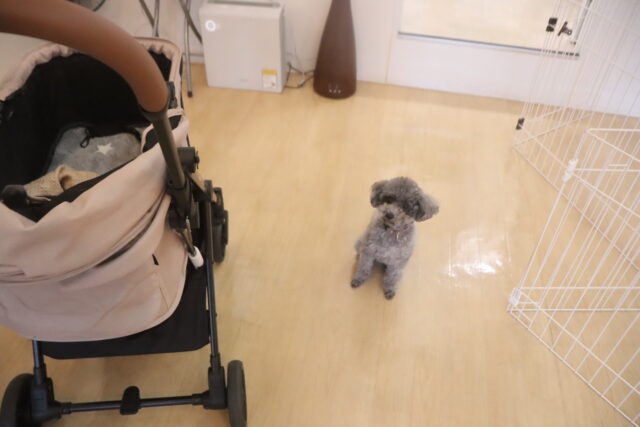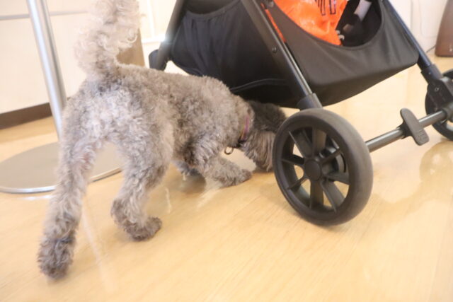 モモちゃんはカートが気になるようだったので動かしてみると、少し距離を取り静かに見守るモモちゃんでした🤭