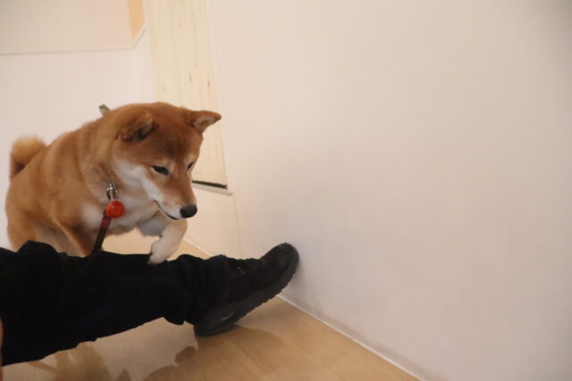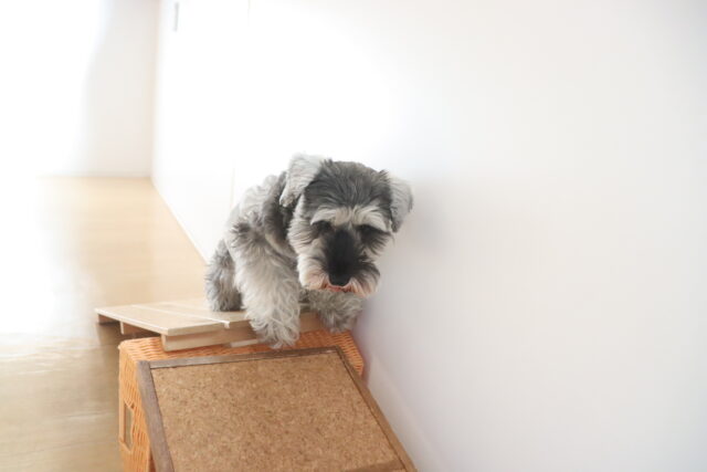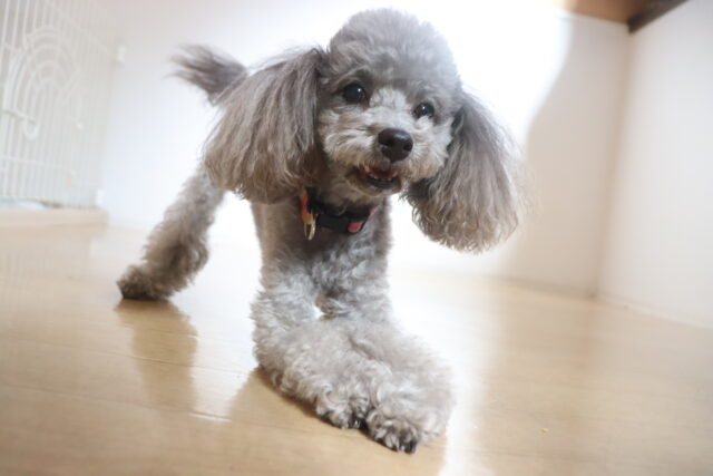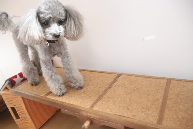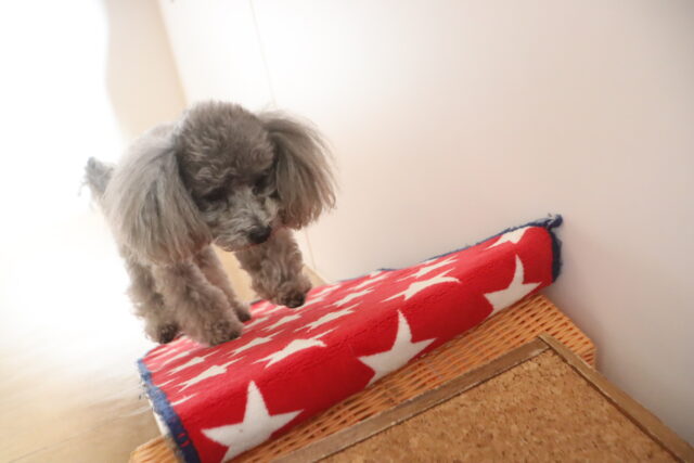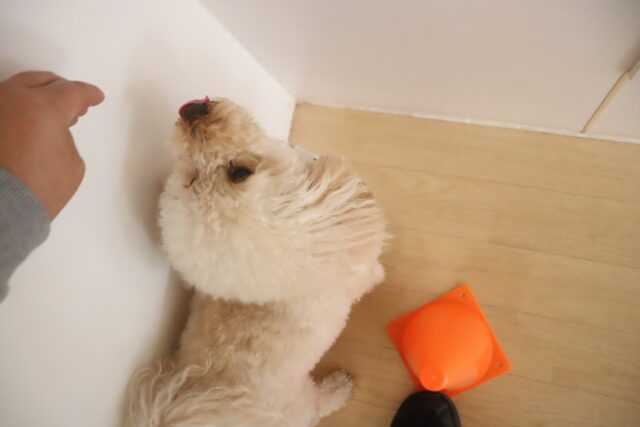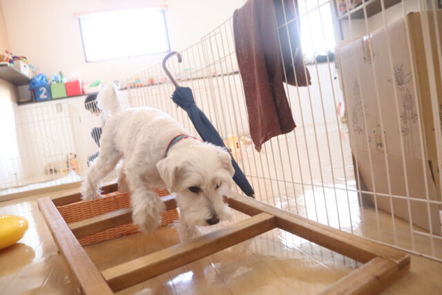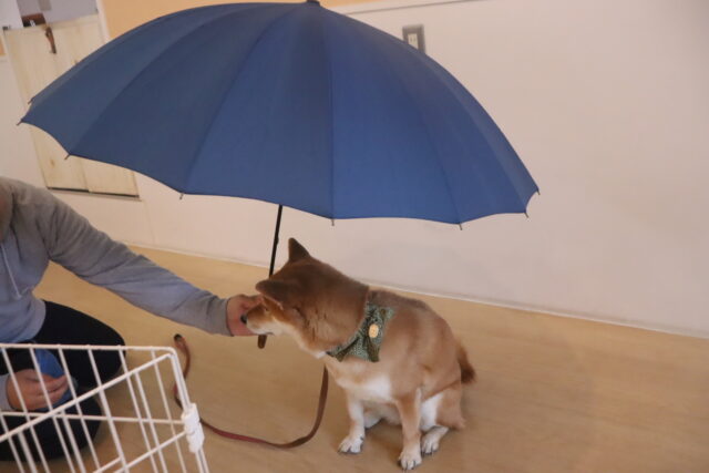 ポチちゃんは傘で物慣れを行いました♪ゆっくりと傘を近づけると警戒気味の様子💦