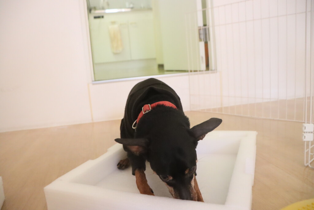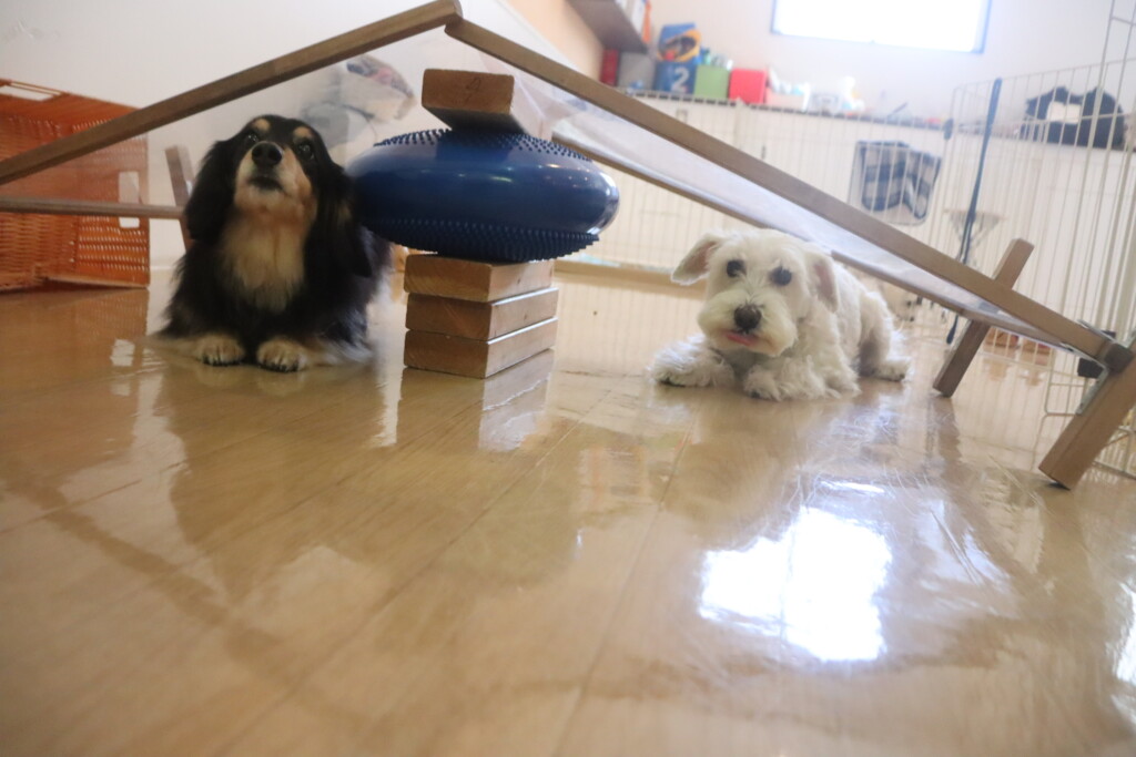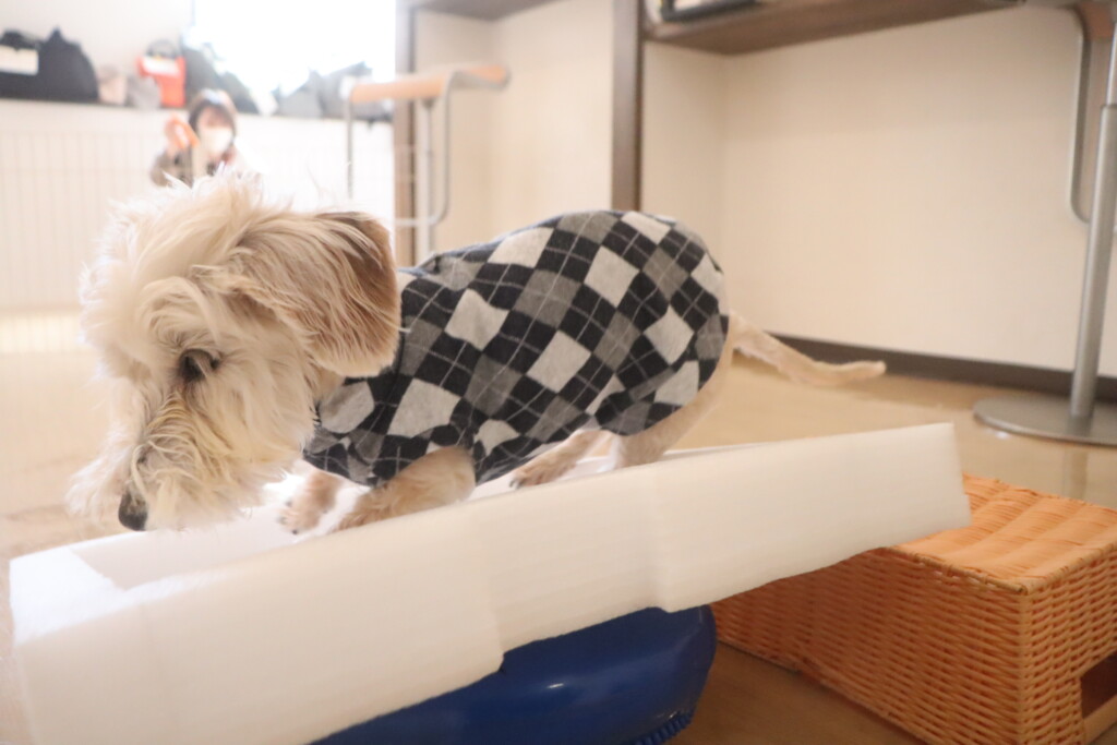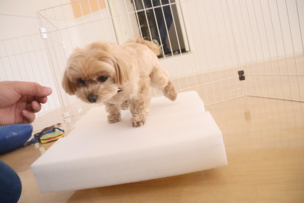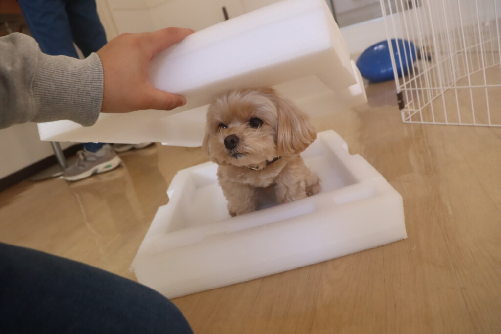 うるくん、ルアくん、サンディちゃん、ハイちゃんは発泡スチロールで物慣れ・足場慣れを行いました!