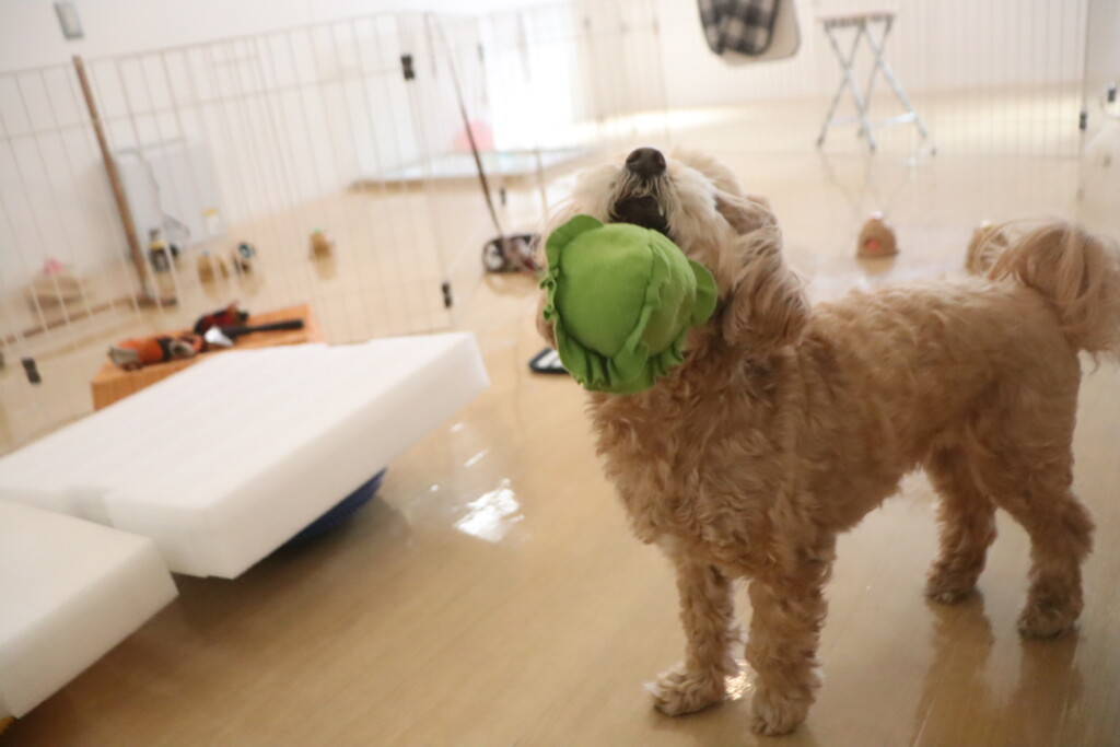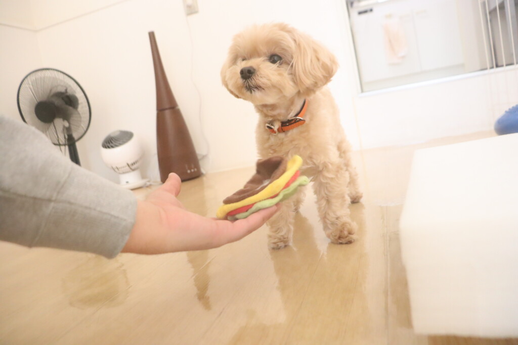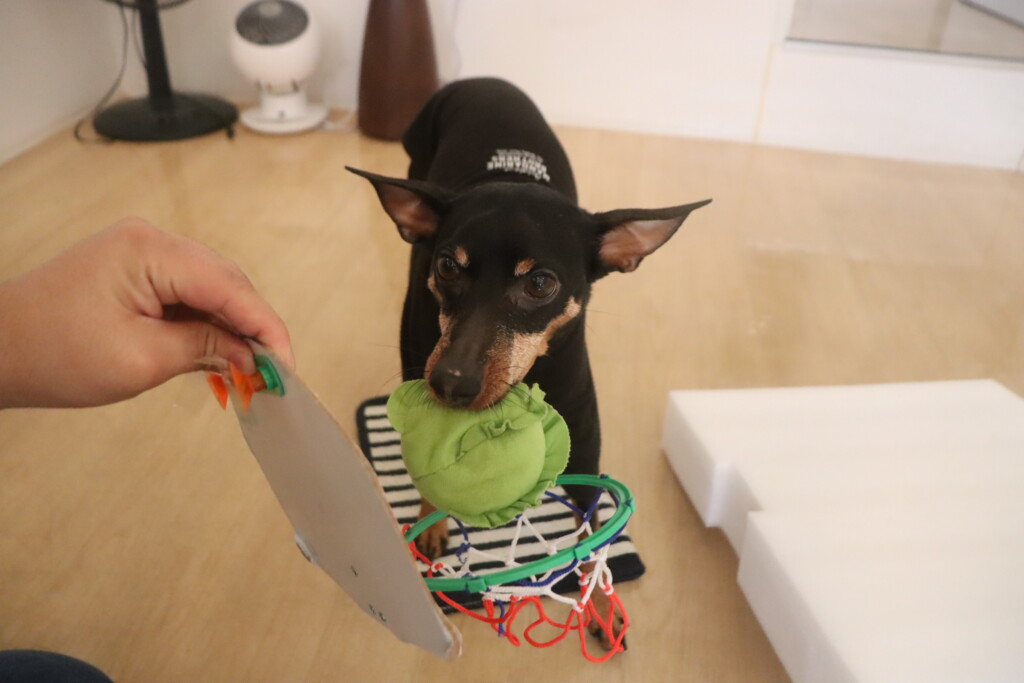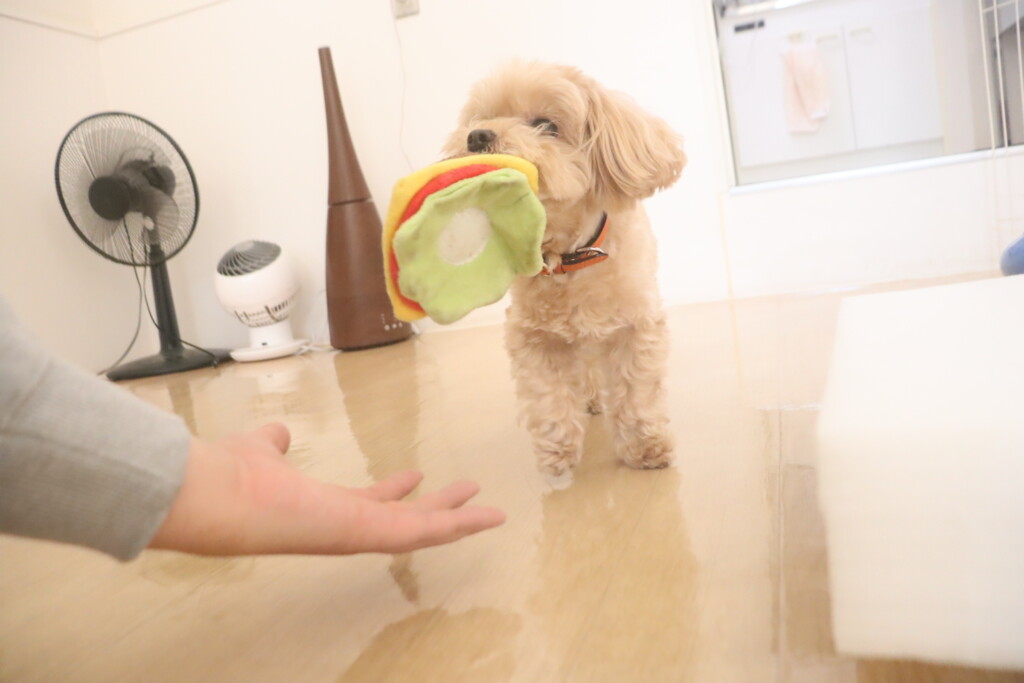 うるくんはハンバーガー作りに向けてまずは具材のレトリーブを練習中です!