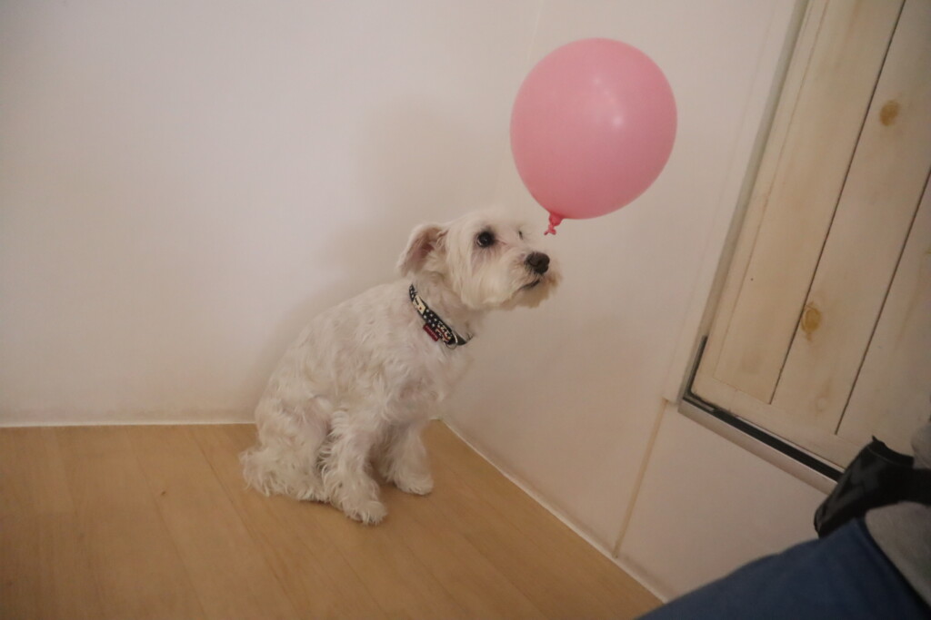 サンディちゃんは頭上から迫って来る発泡スチロールに少し緊張気味でしたが、