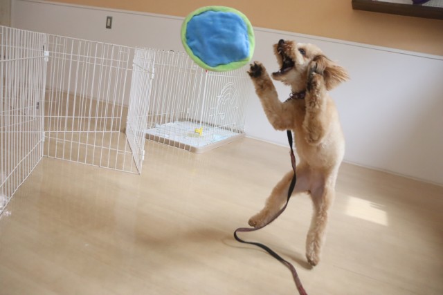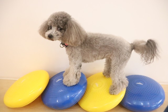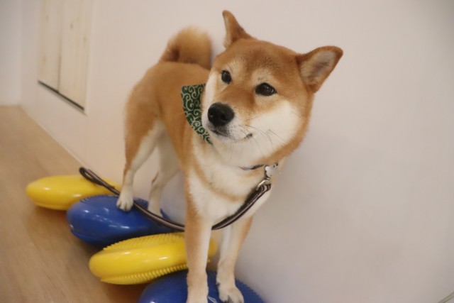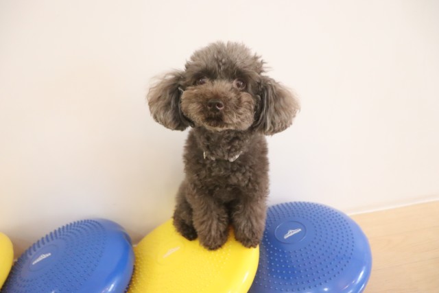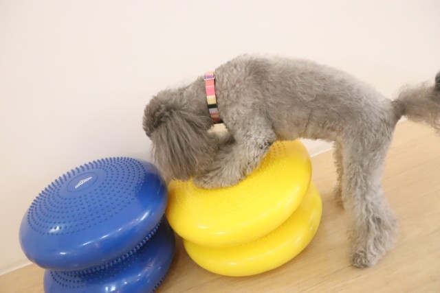 片付けたバランスディスクを見つけ、「これも乗っちゃおうかしら?」とチャレンジしちゃうアンジュちゃん(笑)
