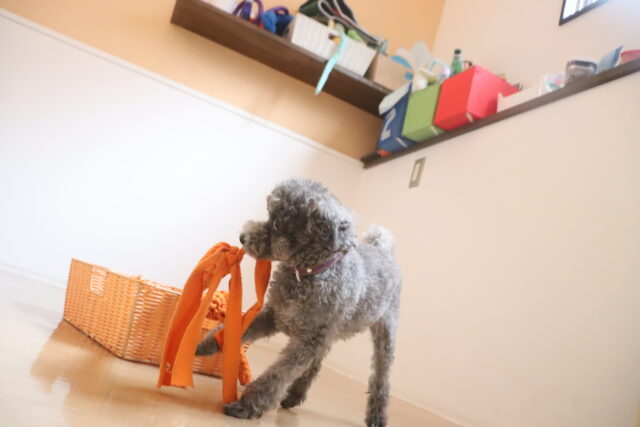 モモちゃんはカゴ付きのロープを引っ張る練習をしました!