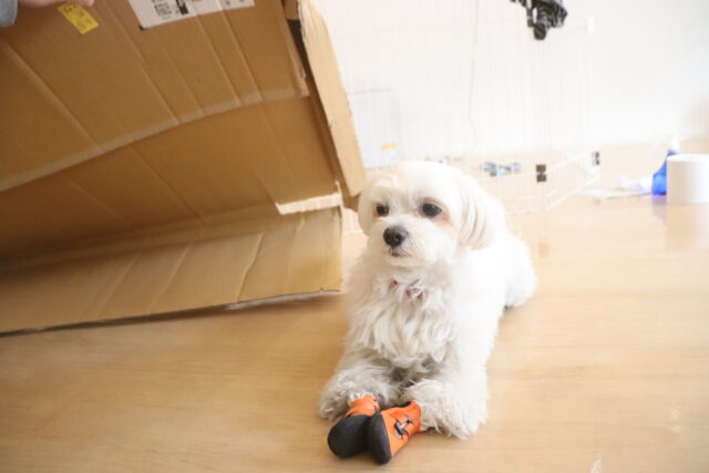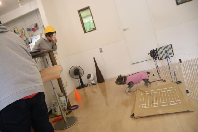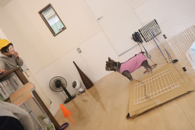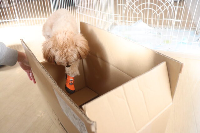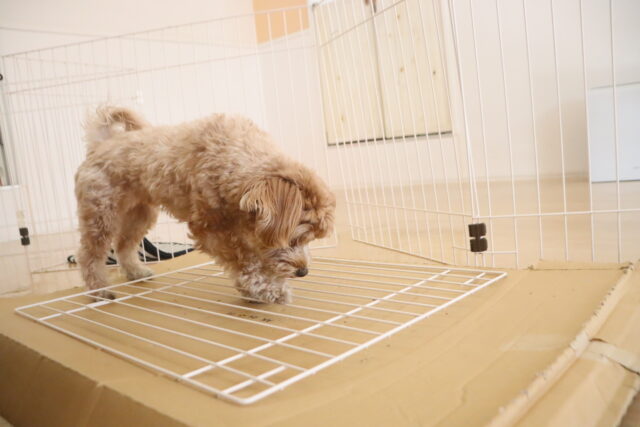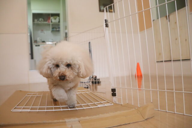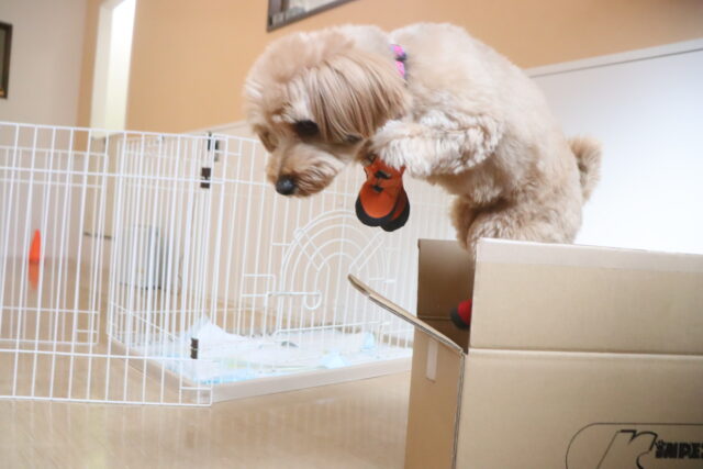アンジュちゃんはダンボールとサークルを重ねた足場の上を渡りました!